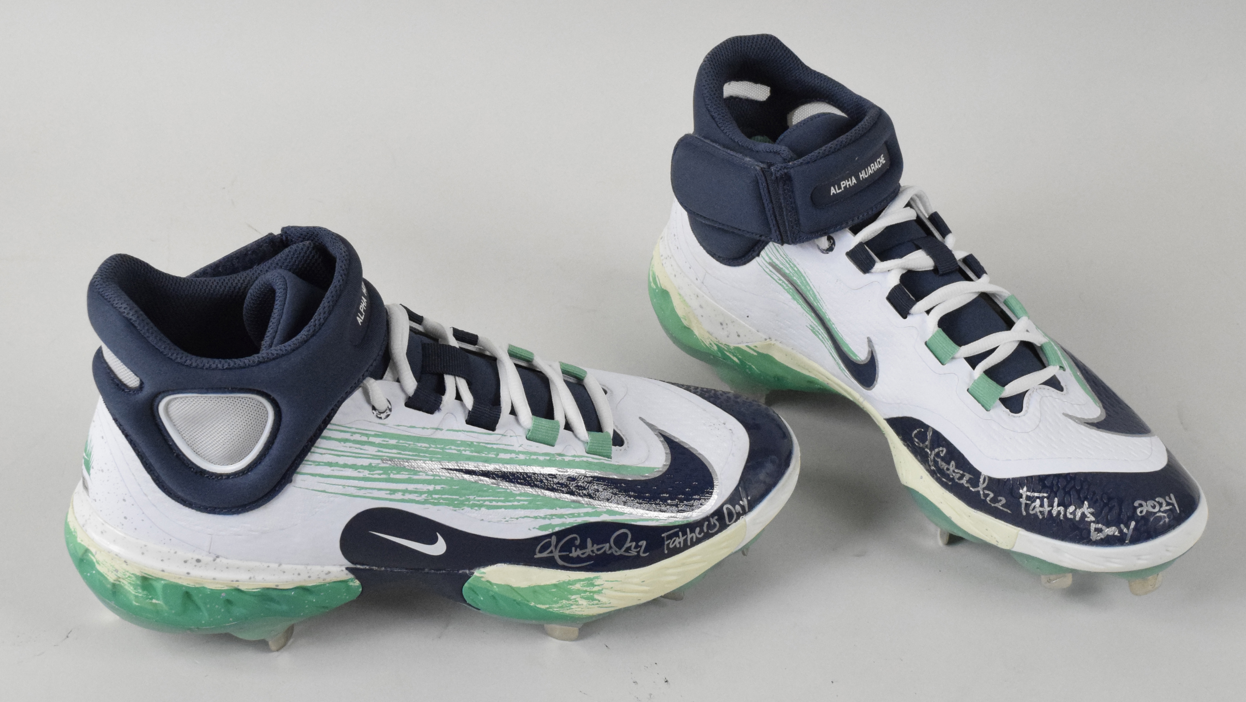Description:Andrew McCutchen signed & inscribed 2024 Father's Day professional model baseball cleats (NM unused). Nike "Alpha Huarache" size 10.5 spikes with #22 decal on both tongue tags. McCutchen signed each cleat in silver marker and added "Father's Day" inscription to one and "Father's Day 2024" inscription to the other. Signatures rate 8 to 9 out of 10. Hunt Auctions serial #ed hologram sticker is on both cleats. Remain in unworn condition: NM ($400-$600)