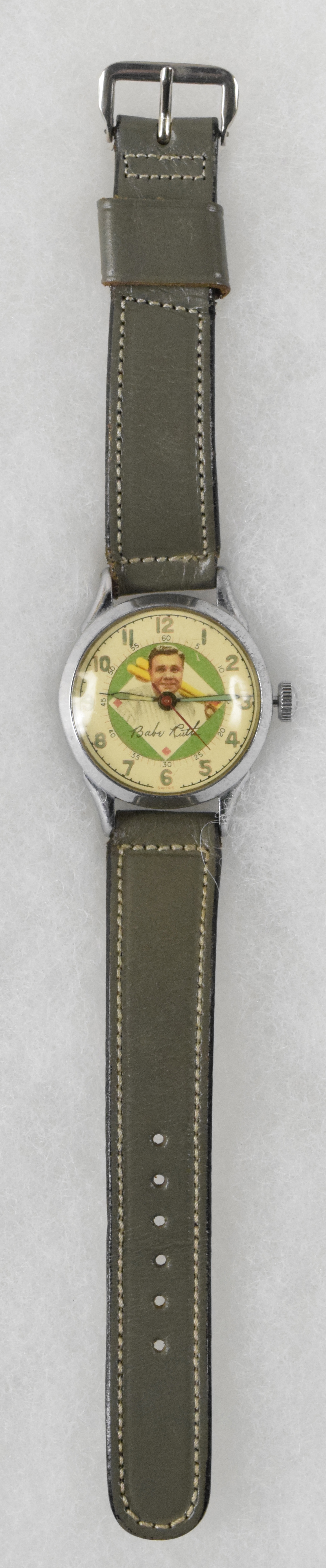 Description:Babe Ruth Watch Co. Exacta wrist watch, c.1948-53 (NM). Produced by the Exacta Time Corporation for the Babe Ruth Watch Co. Inc., the novelty wrist watch was distributed to department stores across the nation. At the center of the face within a green circle is a baseball diamond and a portrait image of Ruth with his facsimile signature below. Minimal wear, with a replacement band: NM