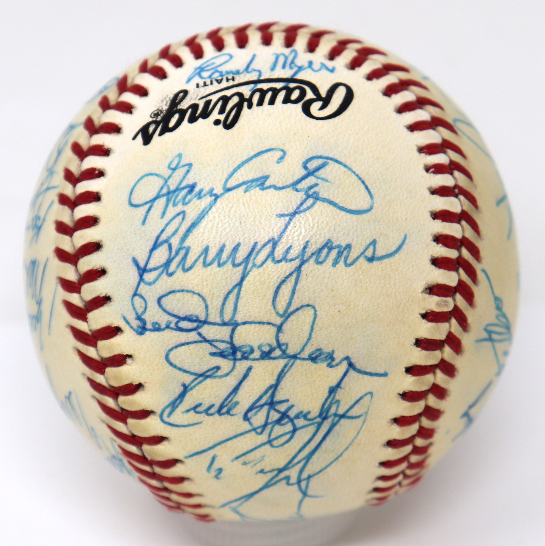 Description:1987 New York Mets team signed baseball (EX/MT). B.Giamatti National League ball signed by (30) including Davey Johnson, Gary Carter, Keith Hernandez, David Cone, Darryl Strawberry, Lenny Dykstra, Howard Johnson, Doc Gooden, Ron Darling, Kevin McReynolds, Roger McDowell, Randy Myers, Wally Backman, Sid Fernandez, Mookie Wilson, Mel Stottlemyre, and others. Signatures rate 7/8 to 9/10 out of 10. Light toning on each panel: EX/MT