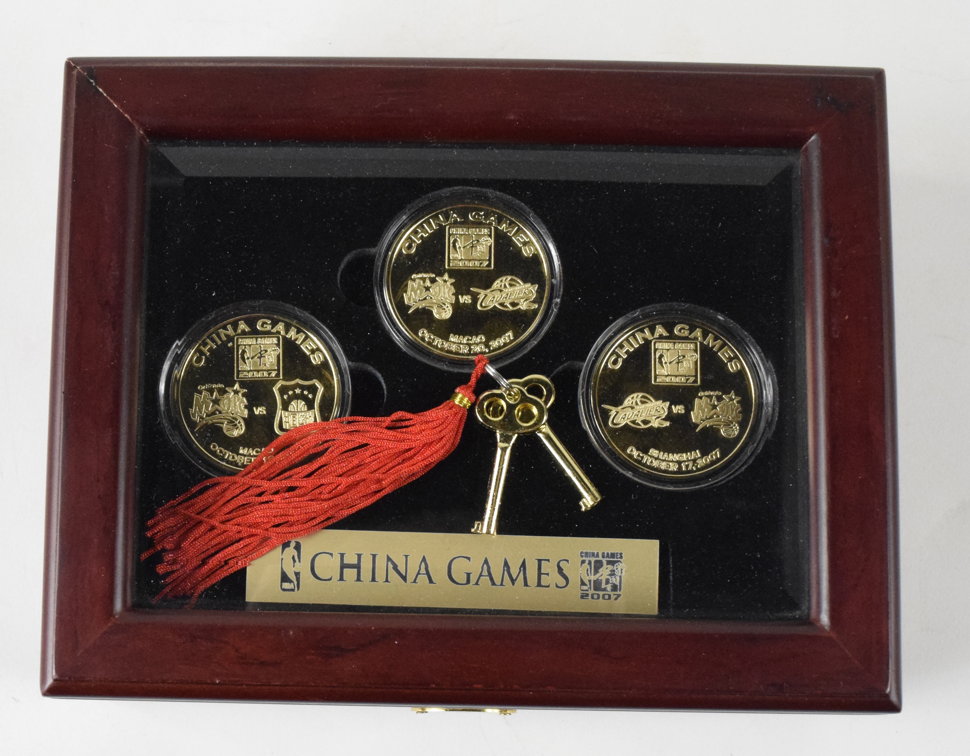 Description:2007 Highland Mint limited edition NBA China Games medallion set (NM-NM/MT). Boxed set contains (3) medallions: 10/17/2007 Cleveland Cavaliers vs Orlando Magic, 10/18/2007 Magic vs Team China, and 10/20/2007 Magic vs Cavaliers. Each is limited edition #44: NM-NM/MT