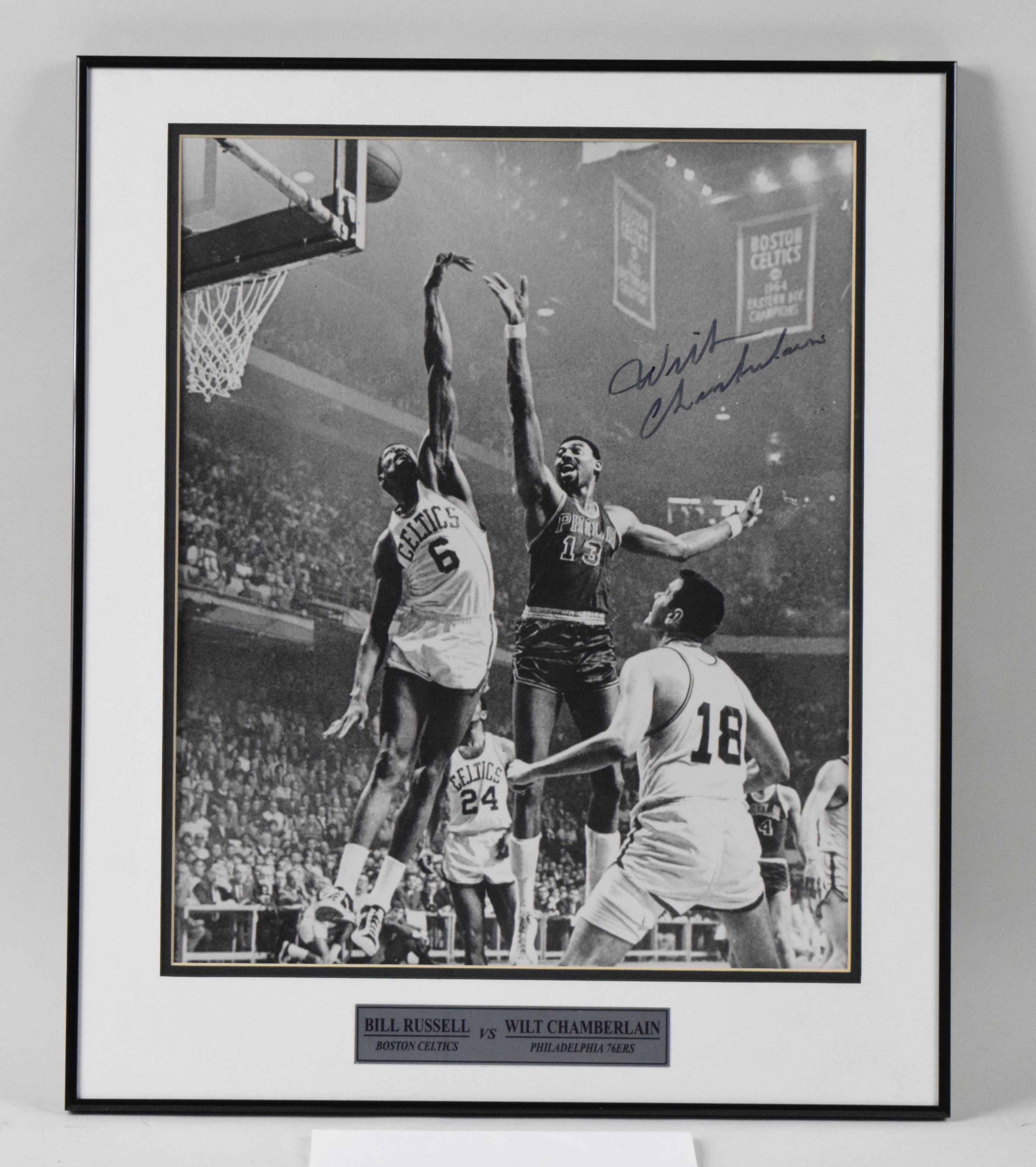 Description:Wilt Chamberlain autographed oversize framed photograph (NM). Frame measures approx. 20"x24". Chamberlain signed the photo in black marker. Signature rates 8 out of 10. Due to framing, complete condition is unknown: NM appearance ($400-$600)