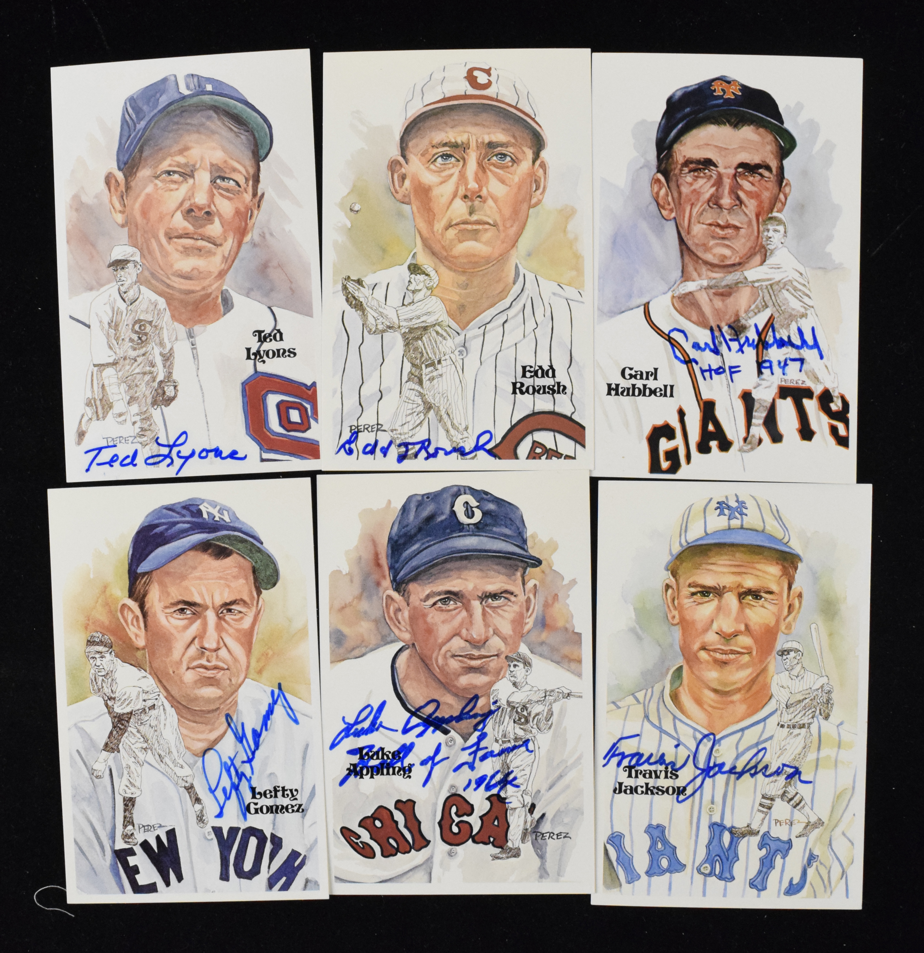Description:Lot of (10) Hall of Famer autographed Perez Steele postcards incl. Ted Lyons (EX/MT-NM) Includes Ted Lyons, Edd Roush, Carl Hubbell (HOF inscription), Luke Appling (HOF inscription), Lefty Gomez, Travis Jackson, Bob Doerr (HOF), and Billy Herman. Marker signatures rate 8 out of 10 or better: EX/MT-NM