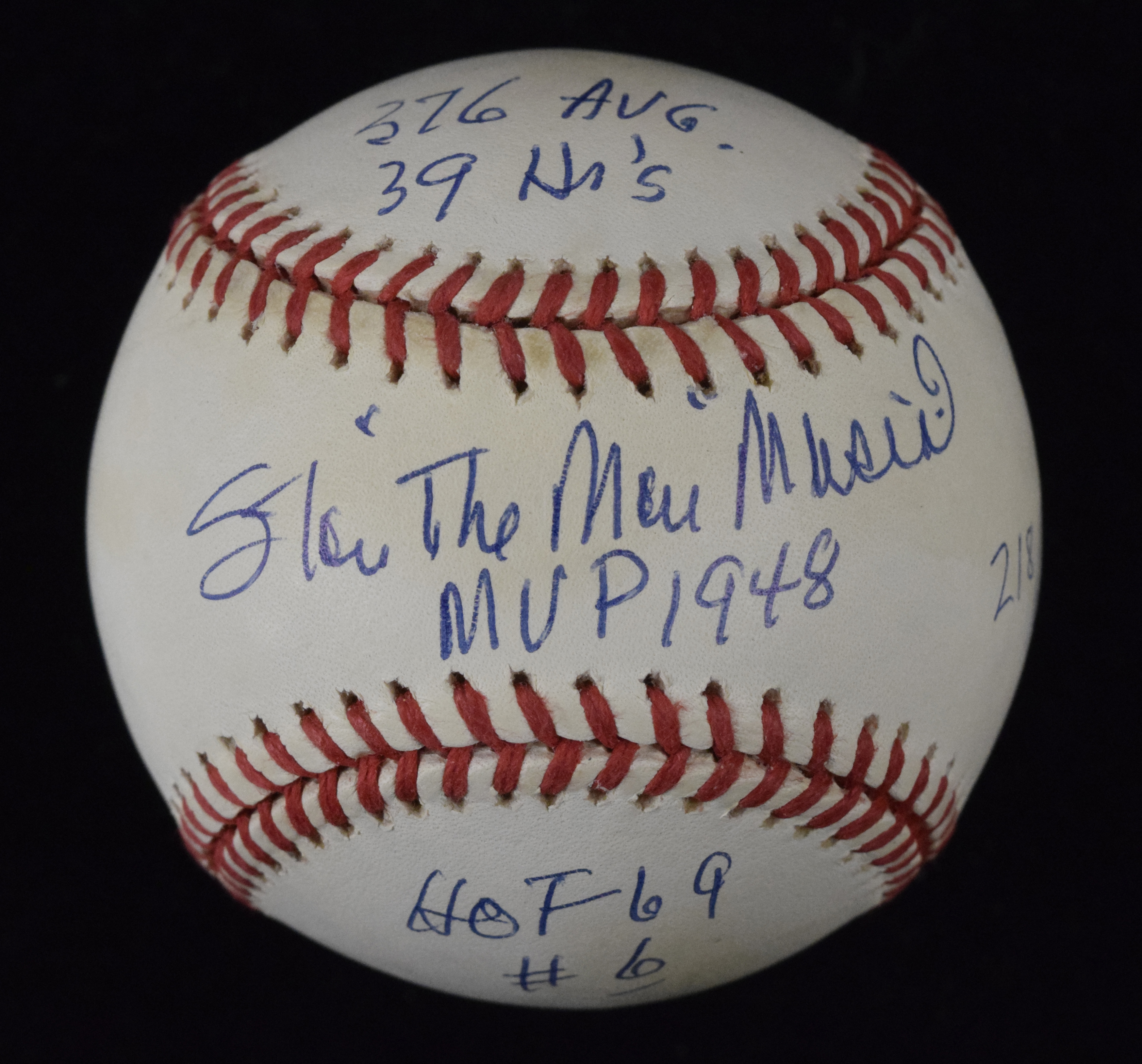 Description:Stan Musial signed 1948 MVP season stat inscribed limited edition baseball (EX/MT-NM) Rawlings L.Coleman ONL ball has been signed and inscribed "The Man, MVP 1948, 376 Avg, 39 HR's, HOF 69, #6." All done in ink rating 8-8/9 out of 10. Hand numbered 218/475 and there is a touch of light toning: EX/MT-NM