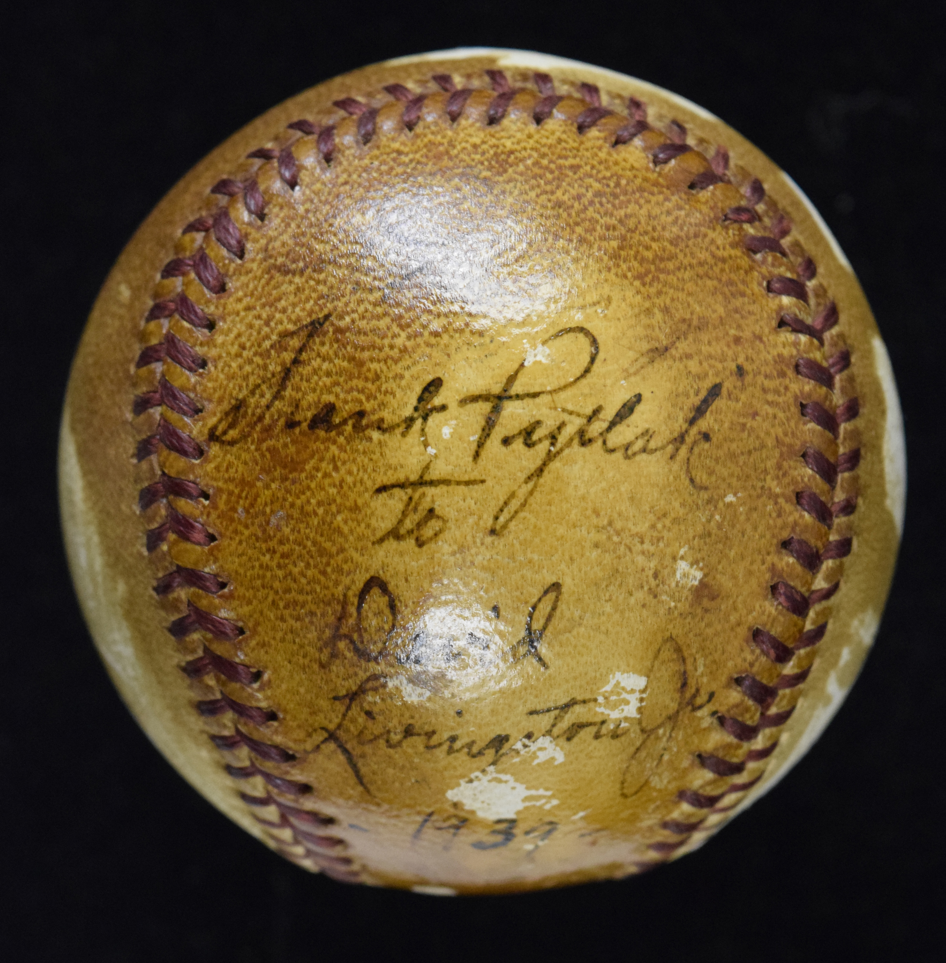 Description:c.1939 Lou Gehrig and Frank Pytlak autographed baseball (See description) Vintage baseball has been signed on the side panel, "Frank Pytlak to David Livingston Jr, 1939" in fountain pen. Just above is a very faint yet still descernable Lou Gehrig signature that has all but faded from view. The signed panel (and portions of others) have been coated in a now toned shellac and there is some moderate general wear: See description