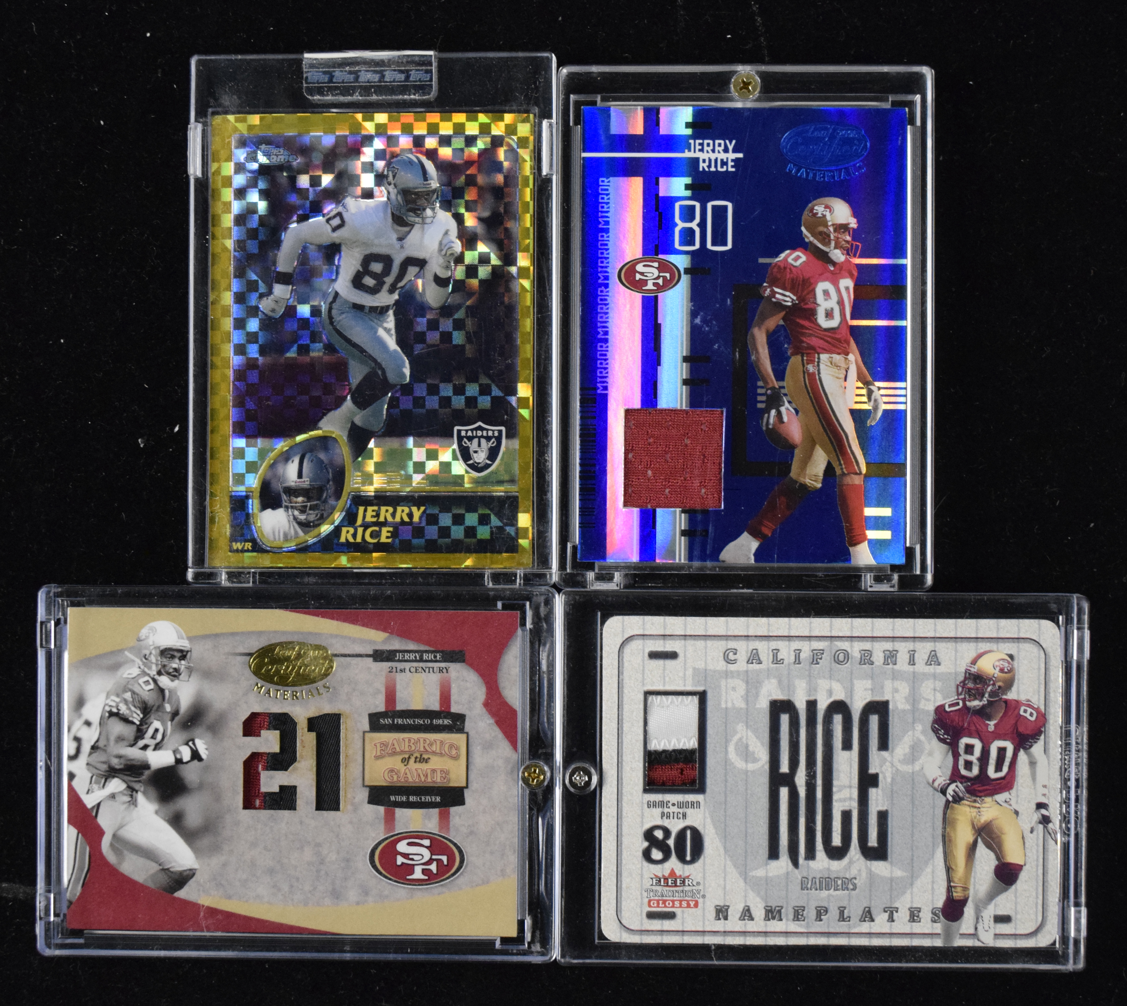 Lot of (10) 2001-2005 Jerry Rice cards incl. (2) X-Fractors (EX-NM) 2000 Donruss Preferred Power (49/50); 2001 Upper Deck Championship Threads patch; 2001 Fleer Tradition Glossy Nameplates patch; 2001 Upper Deck Game Gear patch; 2003 Topps Chrome Gold X-Fractor (31/101 - sealed in case as issued, wear to case); 2003 Topps Finest Gold X-Fractor (61/175 - in case as issued, case has wear); 2003 Topps Pristine Gold Refractor (9/150); 2003 Leaf Certified Mirror Red patch (119/150); 2005 Leaf Certified Materials Fabric of The Game patch (12/21); 2005 Leaf Certified Mirror Blue patch (3/50). Light scattered wear: EX-NM