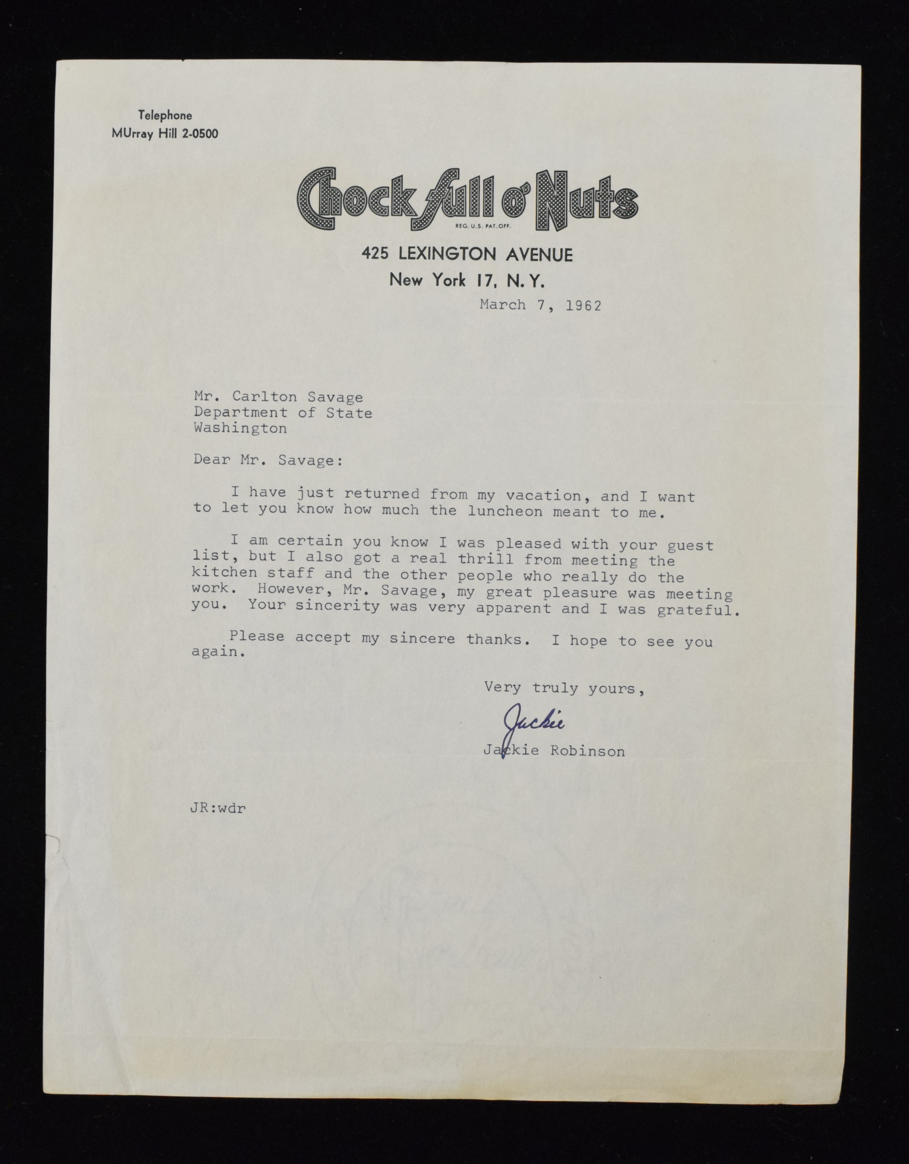 Description:1962 Jackie Robinson autographed letter with "10" graded signature (Sig. PSA "10", letter VG-EX) March 7, 1962 dated letter on Chock full O'Nuts stationary written to diplomat Carlton Savage care of the Department of State. Signed "Jackie" in ink with the autograph graded "10" by PSA. Mailing folds and some other mild handing wear along a touch of toning. Includes full LOA from PSA/DNA: Sig. PSA "10", Letter VG-EX ($750-$1,250)