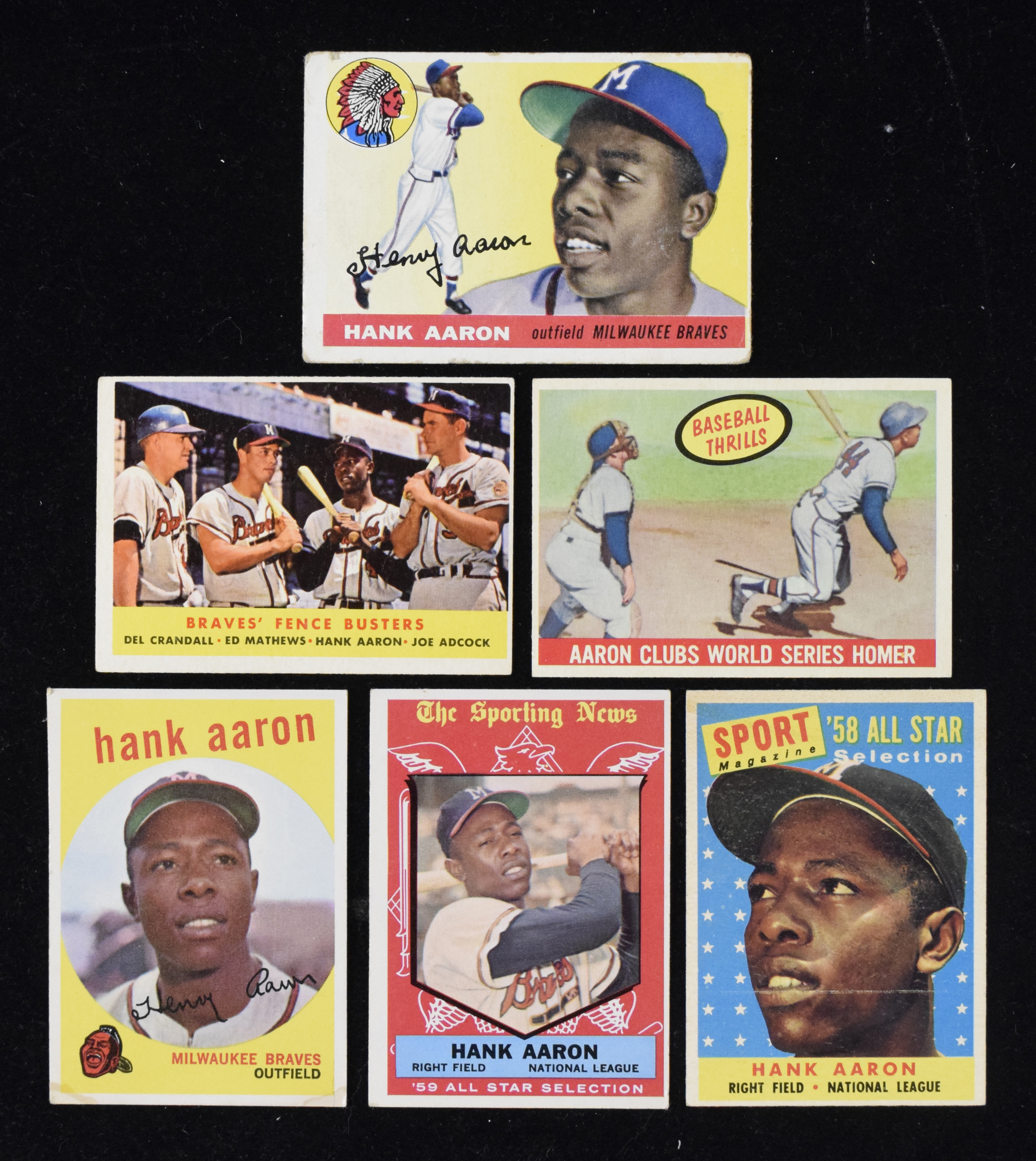 Lot of (6) 1955-1959 Topps Hank Aaron baseball cards (PR-VG) Includes 1955 Topps #47 (PR); 1958 Topps #351 (GD/VG); 1958 Topps #488 (VG); 1959 Topps #380 (GD); 1959 Topps #467 (VG/EX); 1959 Topps #561 (VG): PR-VG