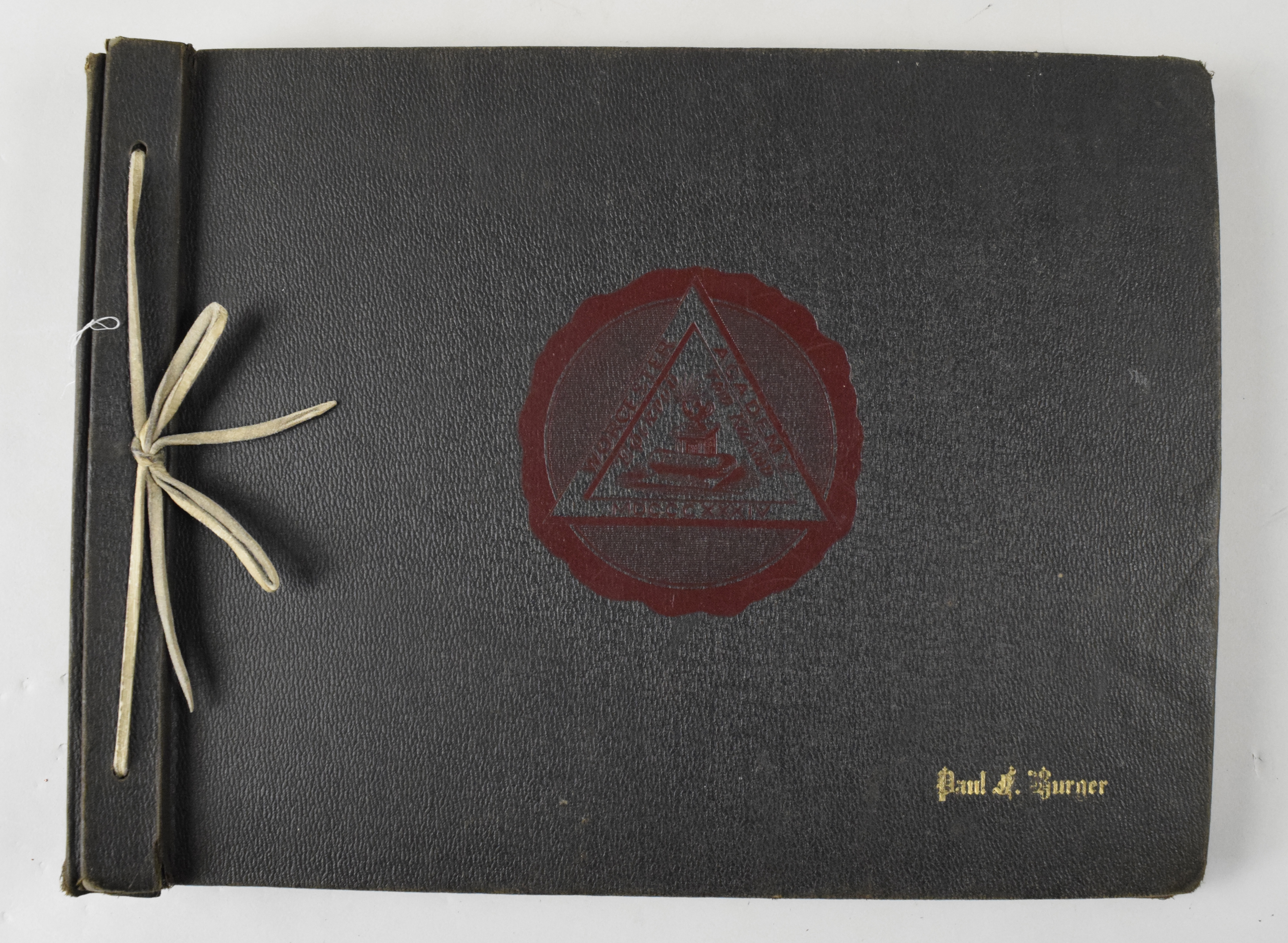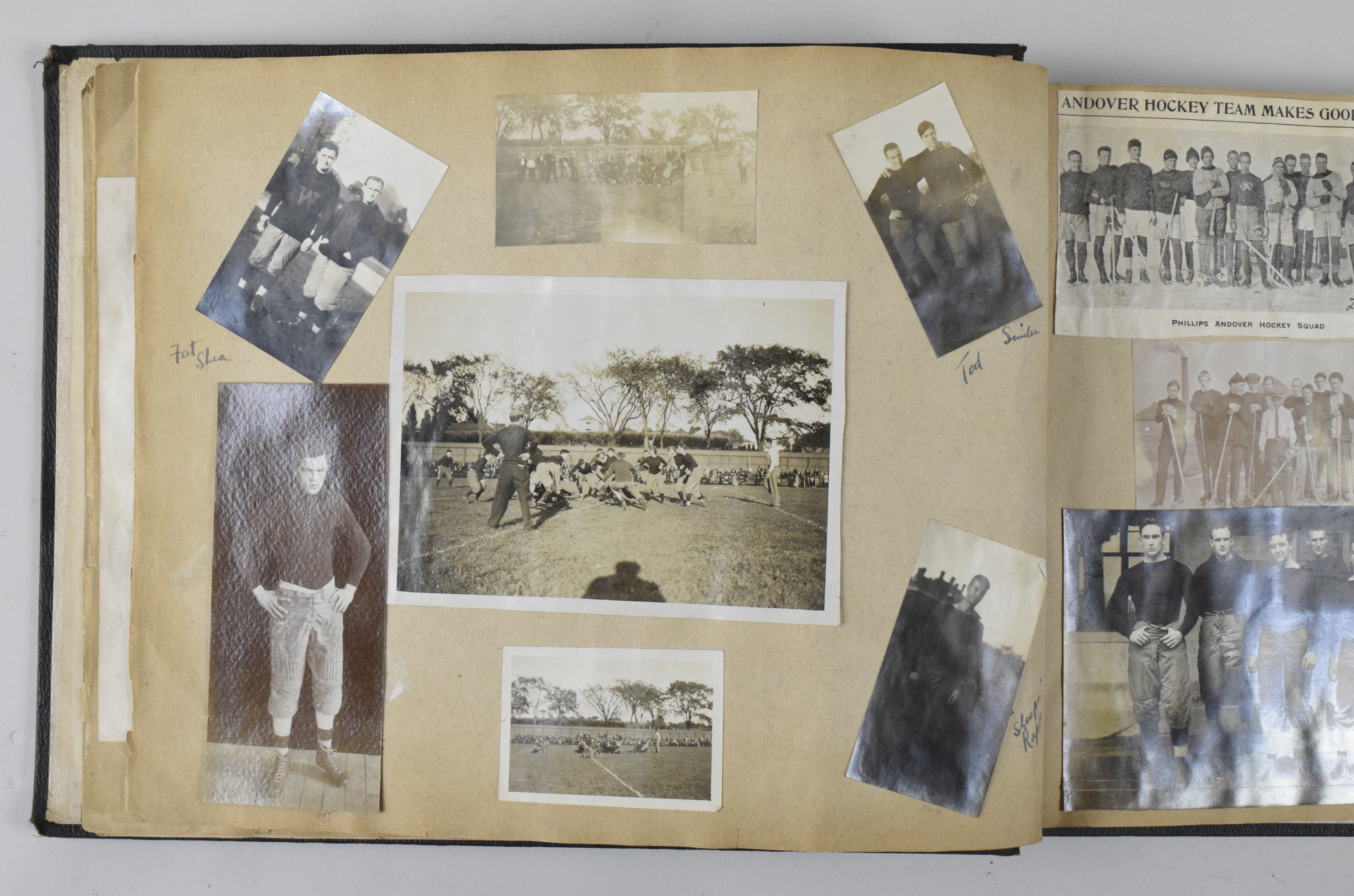 Description:c.1912 Worcester Academy scrapbook with great sports content (GD-EX) Period oversized (12.5"x17") scrapbook with has an impressed "Worcester Academy" crest on the front cover along with the name "Paul F. Berger." It appears to largely related to the c.1912 time period and there is some fantastic sports related material throughout. Some pieces worthy of mention include a large 8"x14" photo captioned "United Basket-Ball League" and showing players from different teams (one of which has "Red Sox" across their jerseys); 1912 Boston Athletic Association tournament program with Tris Speaker pictured inside; many pictures/similar pieces showing athletes including runners, football, hockey, and baseball; newspaper and other publication clippings; portions of scorecards; passes to games/events; some material related to other schools; non-sports related ephemera and photos; and some other pieces. Varying degrees/types of wear throughout and there are some small portions of pages which are cut away and some others where pieces have been removed: GD-EX ($500-$1,000)