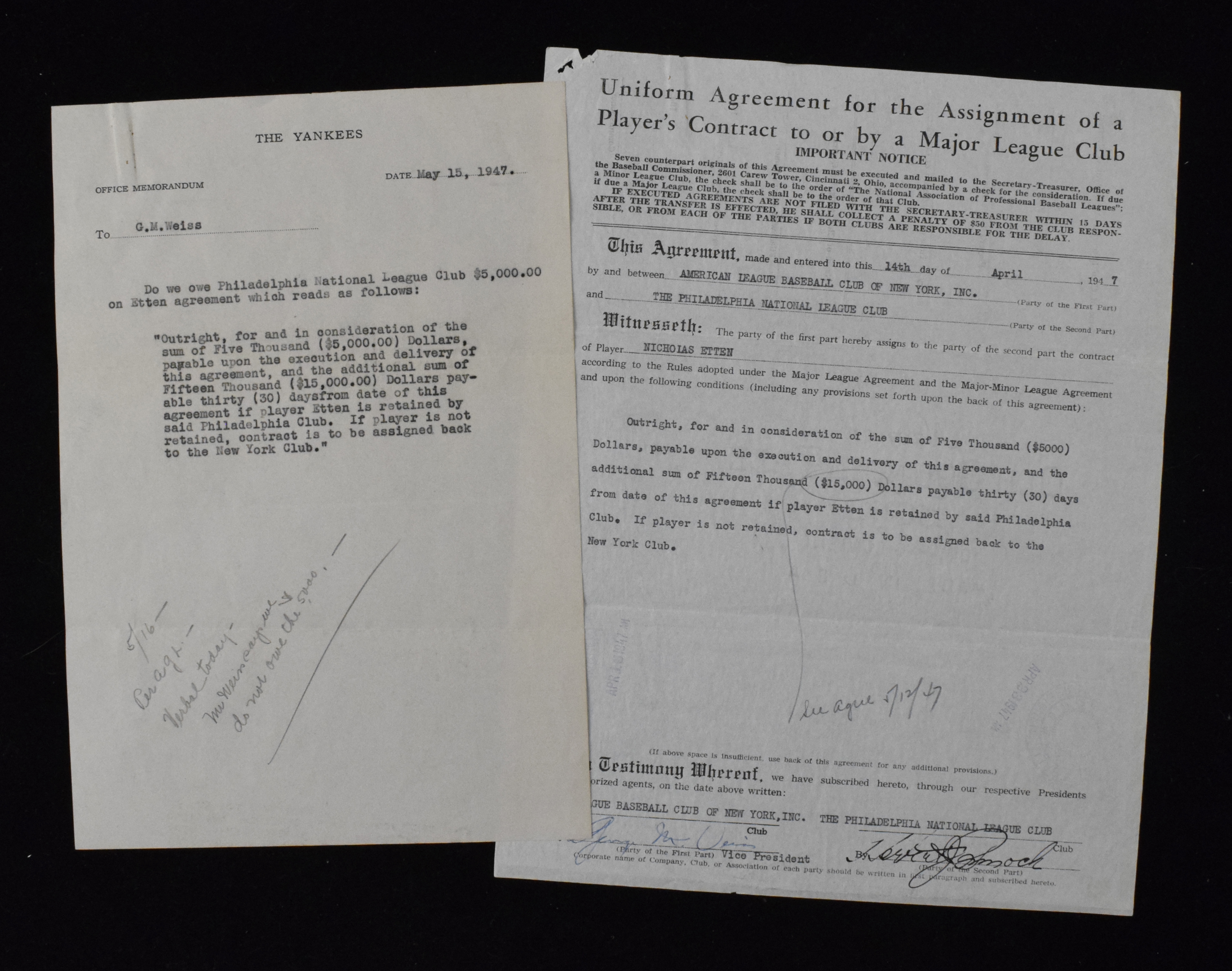 Description:1947 Herb Pennock and George Weiss autographed player transfer agreement (PSA/DNA) (EX-NM) April 14, 1947 dated document transferred player Nick Etten from New York to Philadelphia. Signed by Hall of Famers Herb Pennock (very nice full name example) and George Weiss in ink rating 7 to 8 out of 10. Typical light/mild handling wear including mailing folds and some wrinkles. Includes a typed note on "Yankees" stationary which is related and full LOA from PSA/DNA: EX-NM ($750-$1,000)