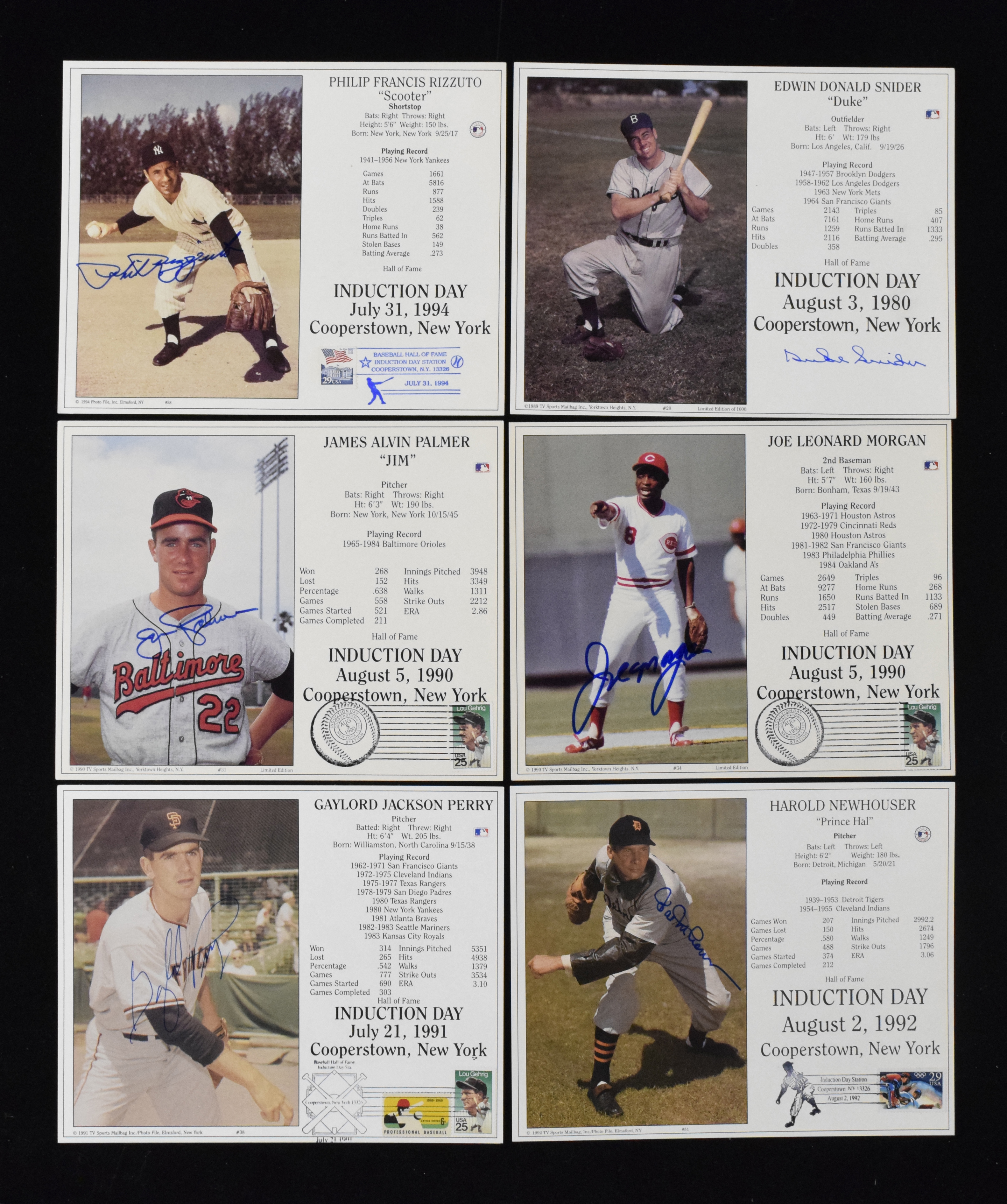 Description:Lot of (15) Hall of Famer autographed 8"x10" stat photo cards (EX-NM) Nice lot of 8"x10" pieces with signers including Joe Morgan, Hal Newhouser, Jim Palmer, Gaylord Perry, Enos Slaughter, Phil Rizzuto, Robin Roberts, Brooks Robinson, Red Schoendienst, Duke Snider, Warren Spahn, Don Sutton, Earl Weaver, Hoyt Wilhelm, and Early Wynn. Marker signatures rate 8 out of 10 or better. Touch of very minor edge toning and/or an extremely minor flaw to a few pieces. A few have stamps and postmarks applied: EX-M