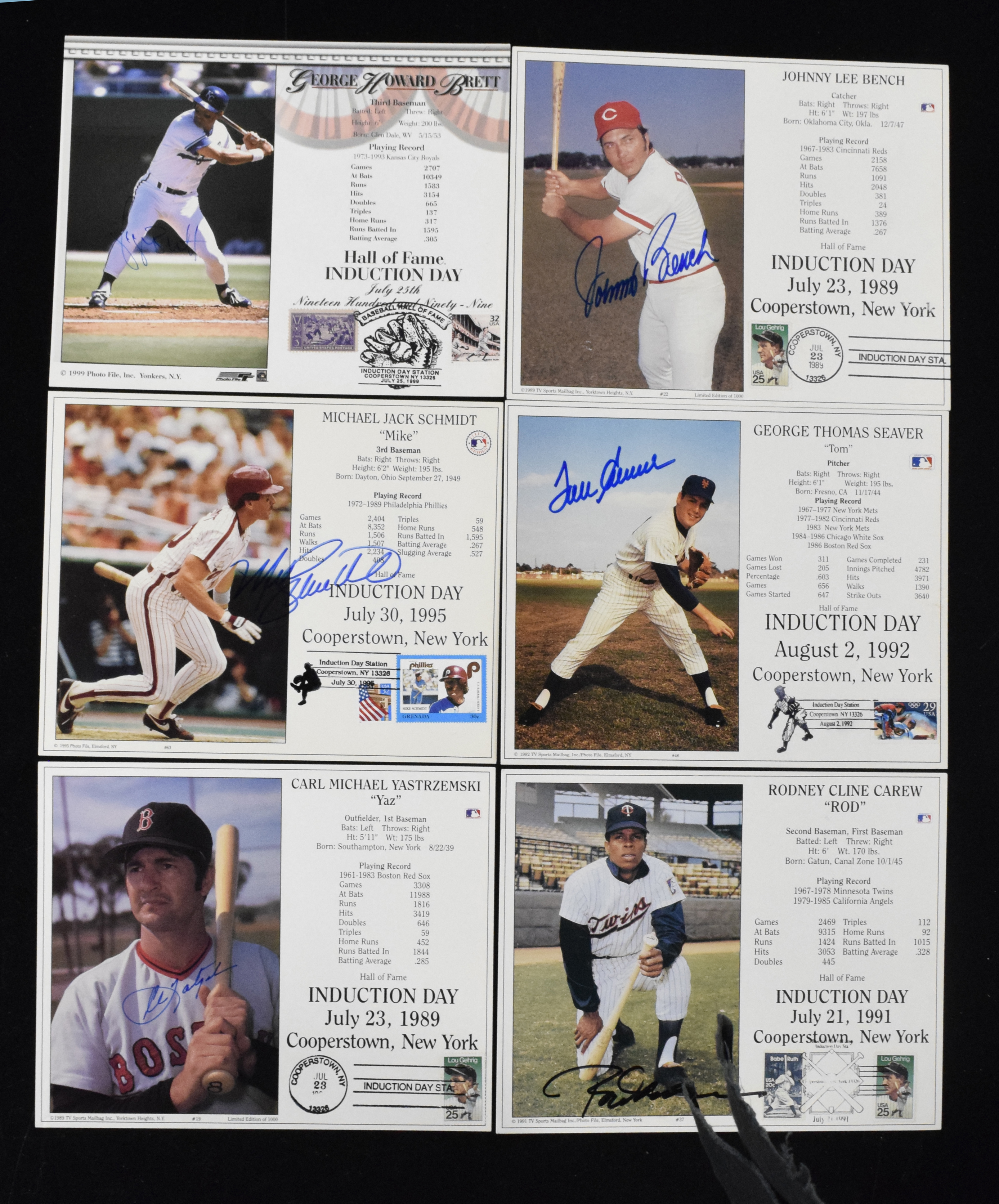 Description:Lot of (14) Hall of Famer autographed 8"x10" stat photo cards (EX-NM) Nice lot of 8"x10" pieces with signers including Pee Wee Reese, Larry Doby, Carl Yastrzemski, Stan Musial, Reggie Jackson, Don Drysdale, Steve Carlton, Rod Carew, Tom Seaver, Willie Stargell, Lou Brock, George Brett, Johnny Bench, and Mike Schmidt. Marker signatures rate 8 out of 10 or better. Touch of very minor edge toning and/or an extremely minor flaw to a few pieces. A few have stamps and postmarks applied: EX-M