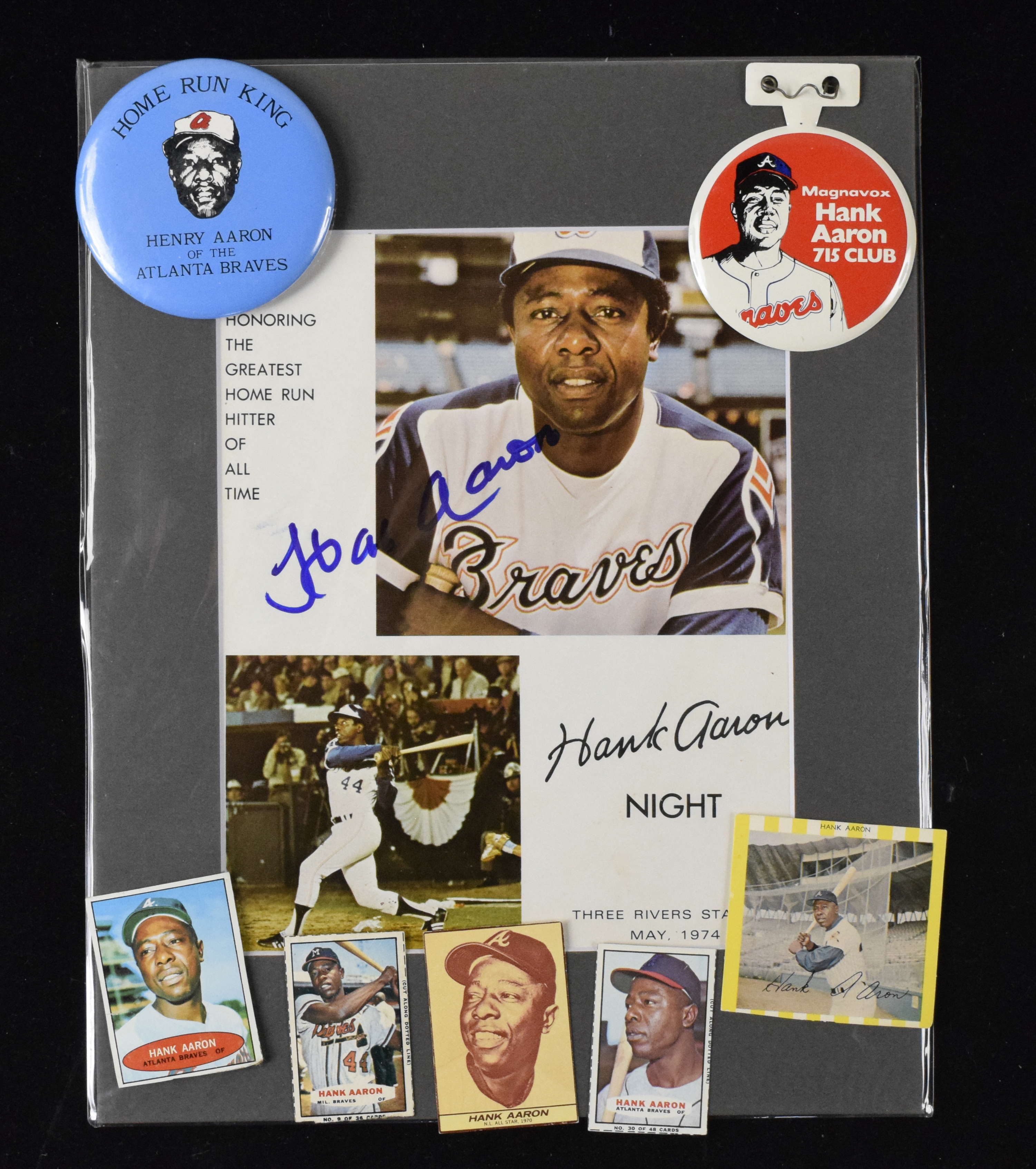 Description:Hank Aaron lot with (2) autographs and 1964-1971 vintage cards (See description) Please note - nearly all cards noted later in this listing are hand cut (as intended) and may or may not fall within third party grading tollerances for size (regardless of stated grade). Includes (2) autographed pieces which are matted to 11"x14" including an 8"x10" photo and similar size program cover from May 1974 Hank Aaron Night at Three Rivers Stadium (signatures rate 8 out of 10, Aaron Night piece has slight flaw near autograph); (3) Aaron related pins incl. 1968 Hank Aaron Night, Magnavox 715 Club, and "Home Run King"; 1964 Topps Giants (VG/EX); 1969 Kahn's (FR); 1971 Milk Duds (VG/EX); Bazooka cards from 1965, 1966, and 1971 (GD); 1971 Dell (EX/MT); and 1981 Atlanta Braves Police. Varying degrees/types of wear throughout: See description