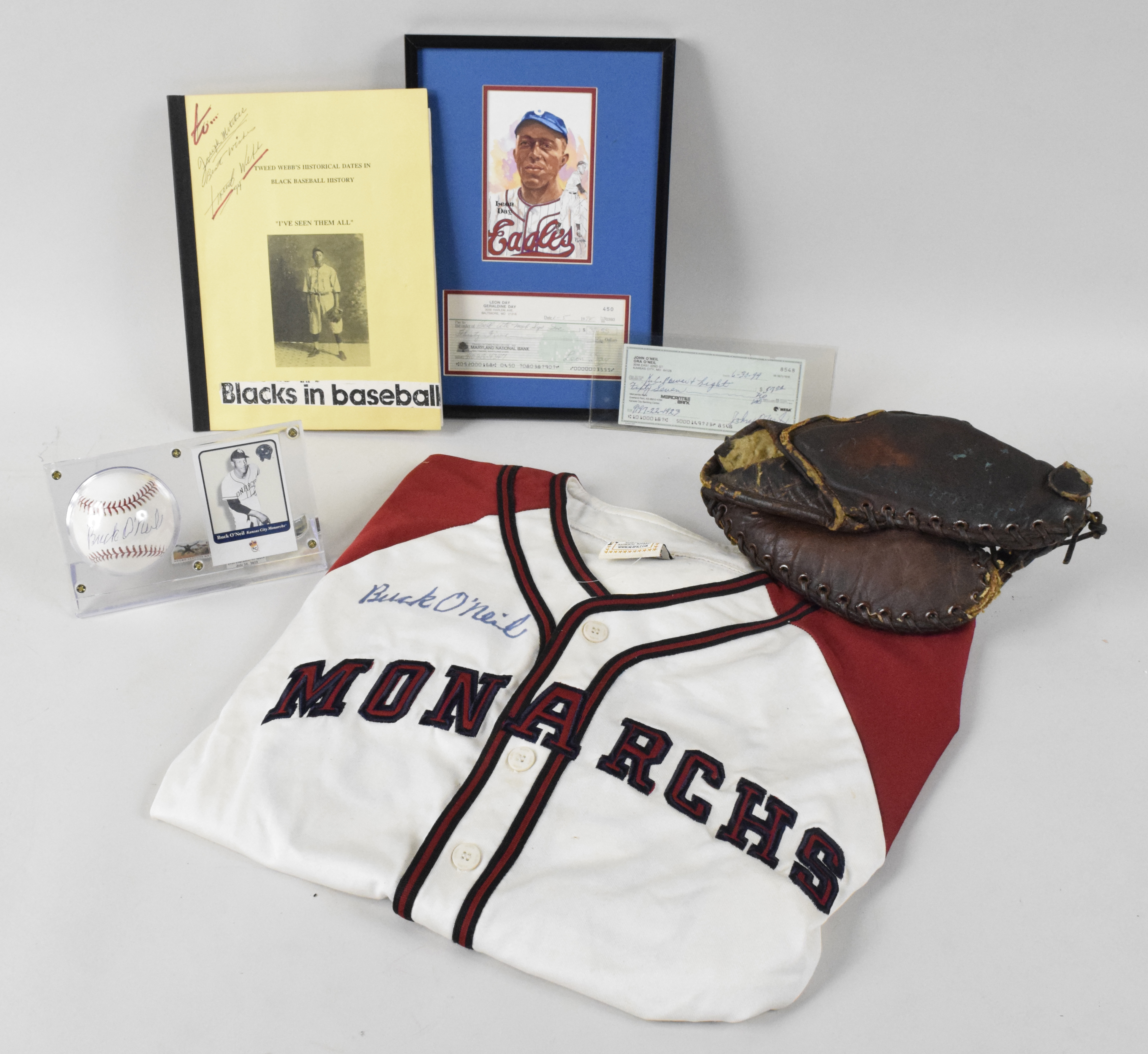 Description:Negro League autograph lot including Hall of Famers and notables (GD-NM) Please note - it should be assumed that there are some minor to moderate condition issues throughout, even when not specifically noted. Includes Leon Day signed check in 8.5"x12.5" frame/display (no glass); Buck O'Neil signed Monarchs retro style jersey (some minor discoloration); "Negro League's Invisible Men" logo hat signed by Buck Leonard, Double Duty Radcliffe, Max Manning, Leon Day, and Buck O'Neil (hat has toning/discoloration/wear and a number of Negro League related pins attached); Buck Leonard and Monte Irvin signed 8"x10" photo showing Casey's Lager can artwork; Buck O'Neil single signed Rawlings B.Selig OML baseball; Wilson faux leather baseball signed by (7) incl. Mahlon Duckett, Stan Glenn, Bill Cash, Gene Benson, and Wilmer Harris (most have added inscriptions); 2007 Pop Lloyd Awards program signed by Bill Cash, Minnie Minosos, Mahlon Duckett, Stan Glenn, and (1) other; Buck O'Neil signed check (small tear); Josh Gibson Jr signed 8"x10" photo (personalized); Stanley Glenn signed Philadelphia Stars related retro style jersey (stains/soiling); Tweed Webb autographed publication which he appears to have prepared himself and may have been a draft proposal for a larger work (personalized); Wilmer Fields autographed Fields Tribute event program (one page, folded over paper stock); 1995 Philadelphia Stars banquet program signed by (10) incl. Dick Allen, Gene Benson, Stan Glenn, Mahlon Duckett, and Bill Cash; Jimmy Dean signed hat; (2) Buck Leonard autographed vintage baseball gloves (note - signatures have condition issues, fading, loss, oxidization, etc); Rawlings B.Brown OAL baseball signed by Ray Dandridge, Lou Dials, and Double Duty Radcliffe; Max Manning autographed t-shirt; and Stanley Glenn, Mahlon Duckett, and Bo Wallace signed small photo/bio papers which were done to promote appearances (laminated, unclear if signatures are on top of lamination or below). Signatures rate 6 to 9/10 out of 10. Varying degrees/types of wear throughout even when not specifically noted: GD-NM