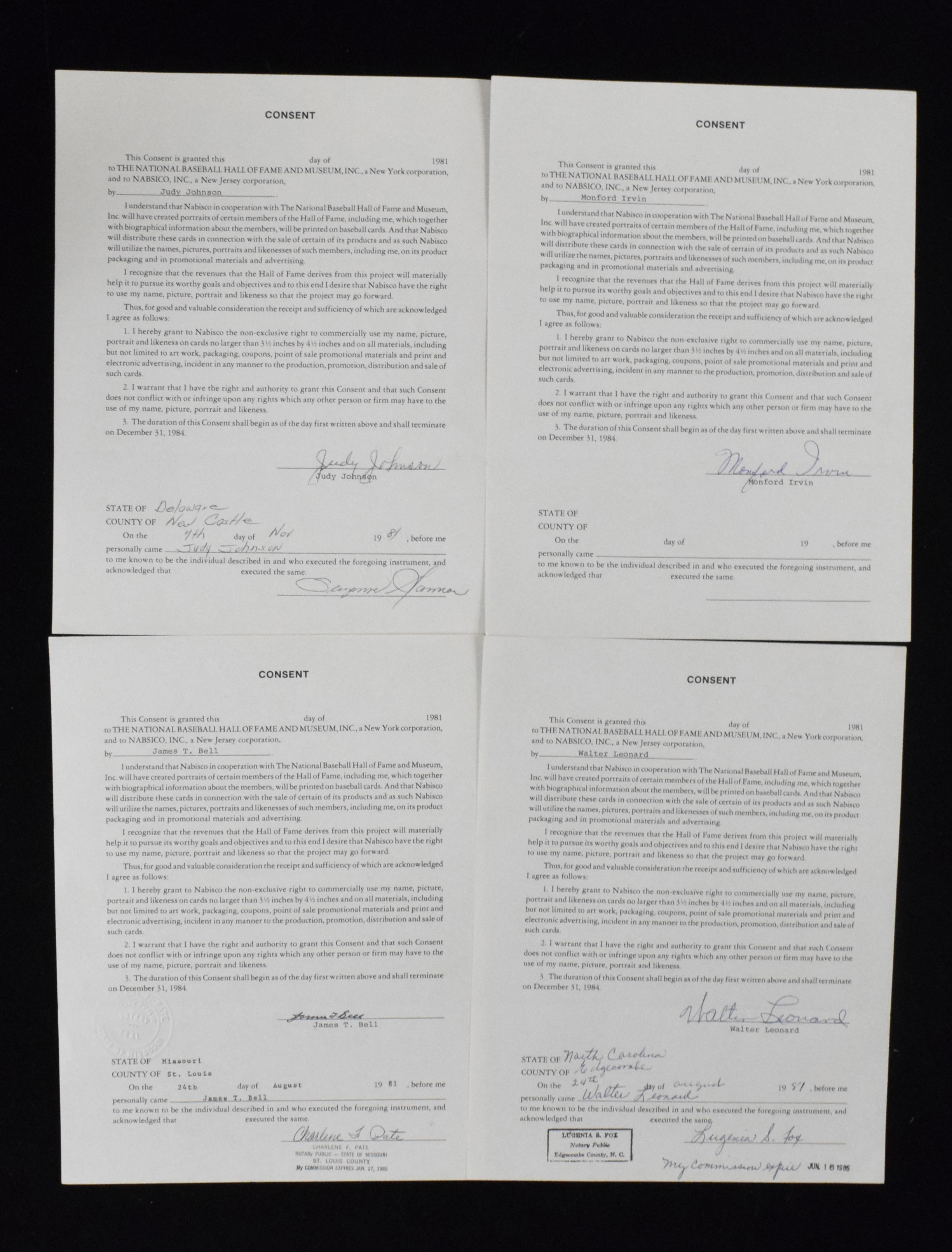 Description:Lot of (4) 1981 Negro League HOFer Nabisco card contracts (EX-NM) Original one page typewritten contracts were issued by Nabisco Co. to produce a series of baseball Hall of Famer cards in the early 1980s. The set never materialized thusly rendering the contracts moot. Players includes Monte Irvin, James "Cool Papa" Bell, Judy Johnson, and Buck Leonard. Signed at the bottom by each player in ink rating 10 out of 10 some in rare full name format. Additionally, the contracts are fully notarized at the bottom dated at the time of signing (except for Monte Irvin which is not notarized): EX-NM