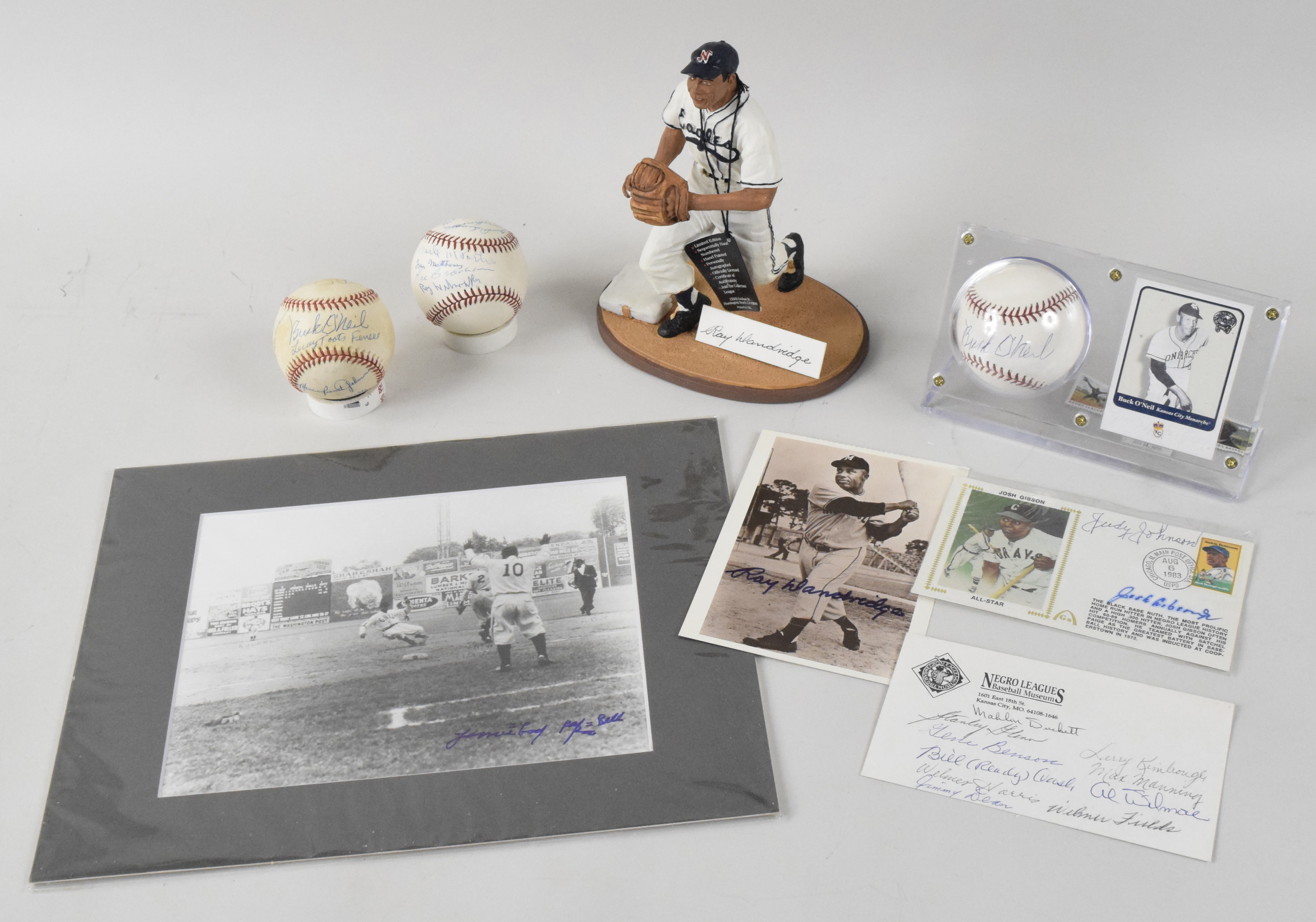 Description:Nice lot of Negro League autographs including Hall of Famers (GD-NM) Includes Buck O'Neil single signed Rawlings B.Selig OML baseball; Ray Dandridge autographed Gartlan statue; Double Duty Radcliffe signed 11"x14" photo and 11"x14" print; Leon Day signed 11"x14" photo; Cool Papa Bell signed photo matted to 11"x14"; Judy Johnson and Josh Gibson Jr signed postal cover; Negro League Museum envelope signed by Mahlon Duckett, Max Manning, Bill Cash, Gene Benson, Wilmer Fields, and a few others; 2004 event program signed by Bill Cash, Buck O'Neil, Mahlon Duckett, and a few others; 1986 event program signed by Leon Day, Max Manning, Gene Benson, Bill Cash, and a few others; Lou Dials and (2) Buck O'Neil signed checks; Buck O'Neil signed Satchel Paige postal cover; small Ray Dandridge signed photo; "Judy Johnson Night" commemorative cards including pieces signed by Buck O'Neil, Josh Gibson Jr, Mrs. Leon Day, Mrs. Buck Leonard, Bill Cash, Mahlon Duckett, Peanuts Johnson, Monte Irvin, and one which has a cut signature of Judy Johnson affixed (an addition appears to be secreterial); Rawlings G.Budig OAL ball signed by (11) incl. Buck O'Neil, Peanuts Johnson, Wilmer Fields, Stan Glenn, and Double Duty Radcliffe (toned and some signatures have faded); Rawlings B.Brown OAL ball signed by (10) former players. Signatures rate 7 to 9 out of 10 (small portion lesser) and there are varying degrees of mostly light scattered wear: GD-NM