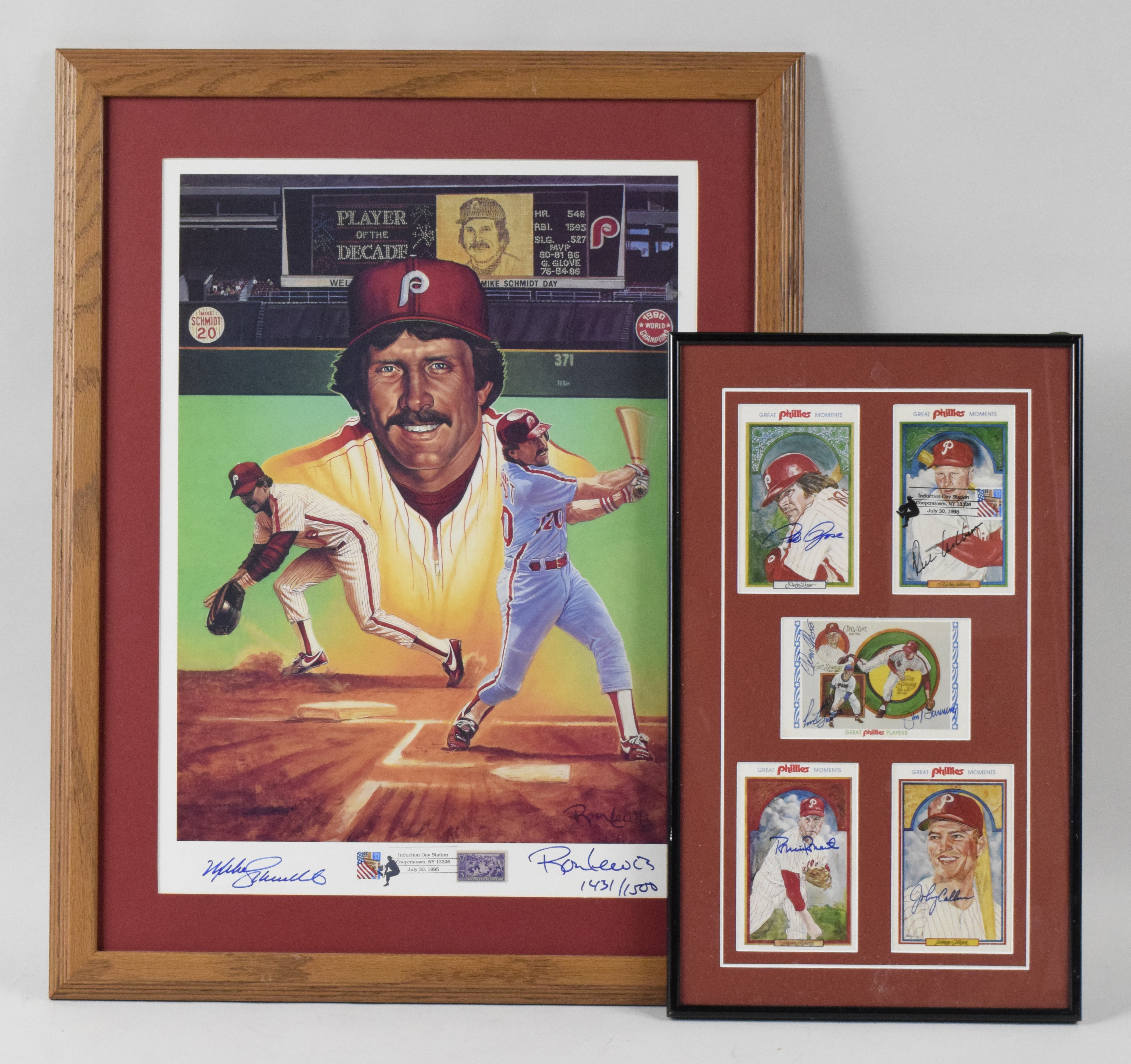 Description:Lot of (3) Phillies related autographed framed displays with HOFers (EX-NM) Includes 12.25"x20.25" frame holding (5) signed postcards including single signed Richie Ashburn, Robin Roberts, and Johnny Callison and a piece signed by Jim Bunning, Curt Simmons, and Chris Short. An additional of Pete Rose appears to be secreterial; framed (18"x24") poster/print signed by Harry Kalas and there is a Richie Ashburn signed 1959 Topps card mounted within; framed (22.5"x28.5") Mike Schmidt signed limited edition Ron Lewis print. There are stamps and a Hall of Fame Induction related postmark along the bottom. Signatures rate 8 to 9 out of 10. Light wear to frames: EX-NM