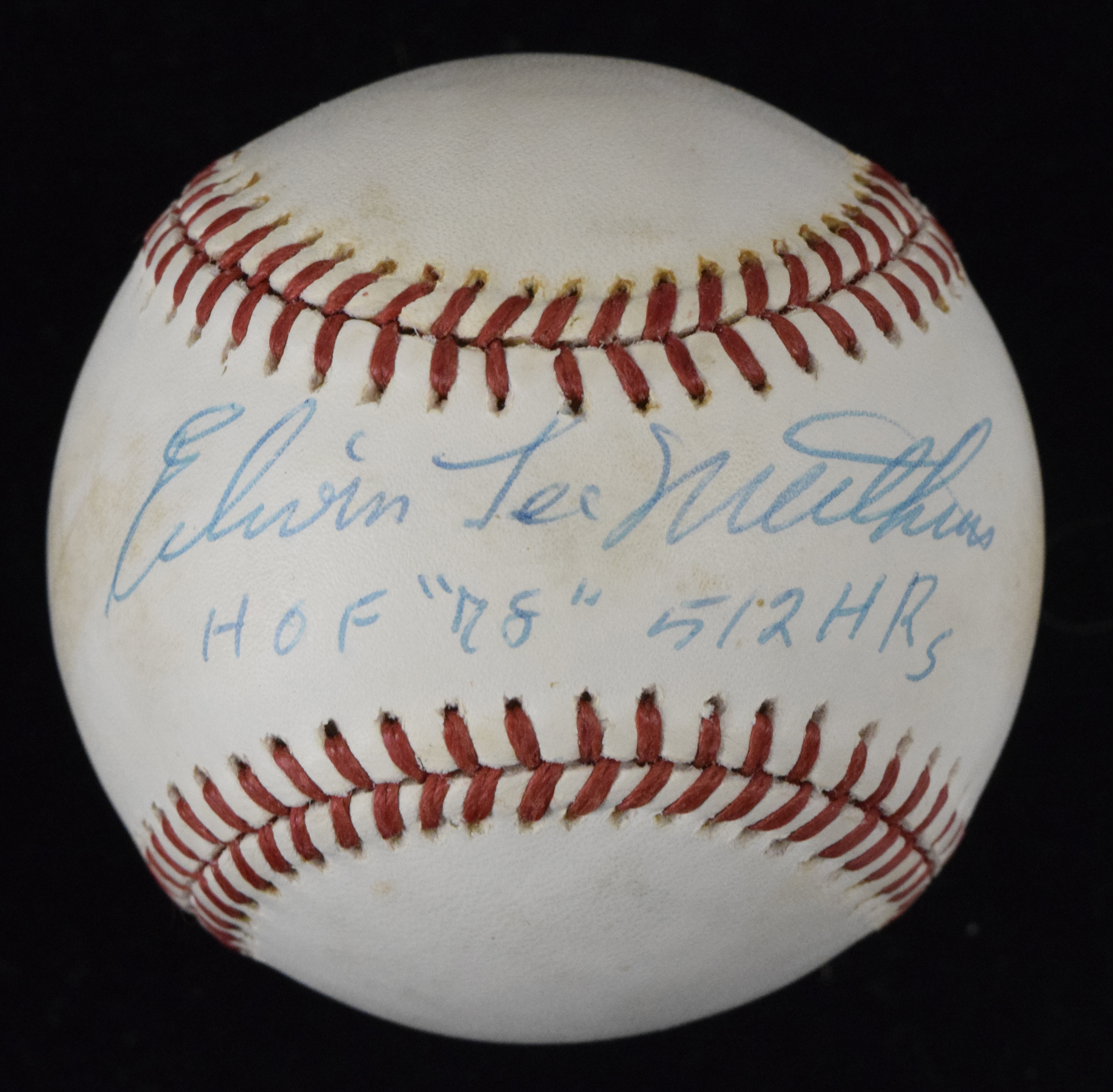 Description:Eddie Mathews full name single signed and HOF/HR total inscribed ball (JSA) (EX/MT) Rawlings W.White ONL ball signed "Edwin Lee Mathews, HOF 78, 512 HRs" in ink rating 7/8-8 out of 10. Touch of light discoloration. JSA sticker affixed (P80039), COA is not included: EX/MT