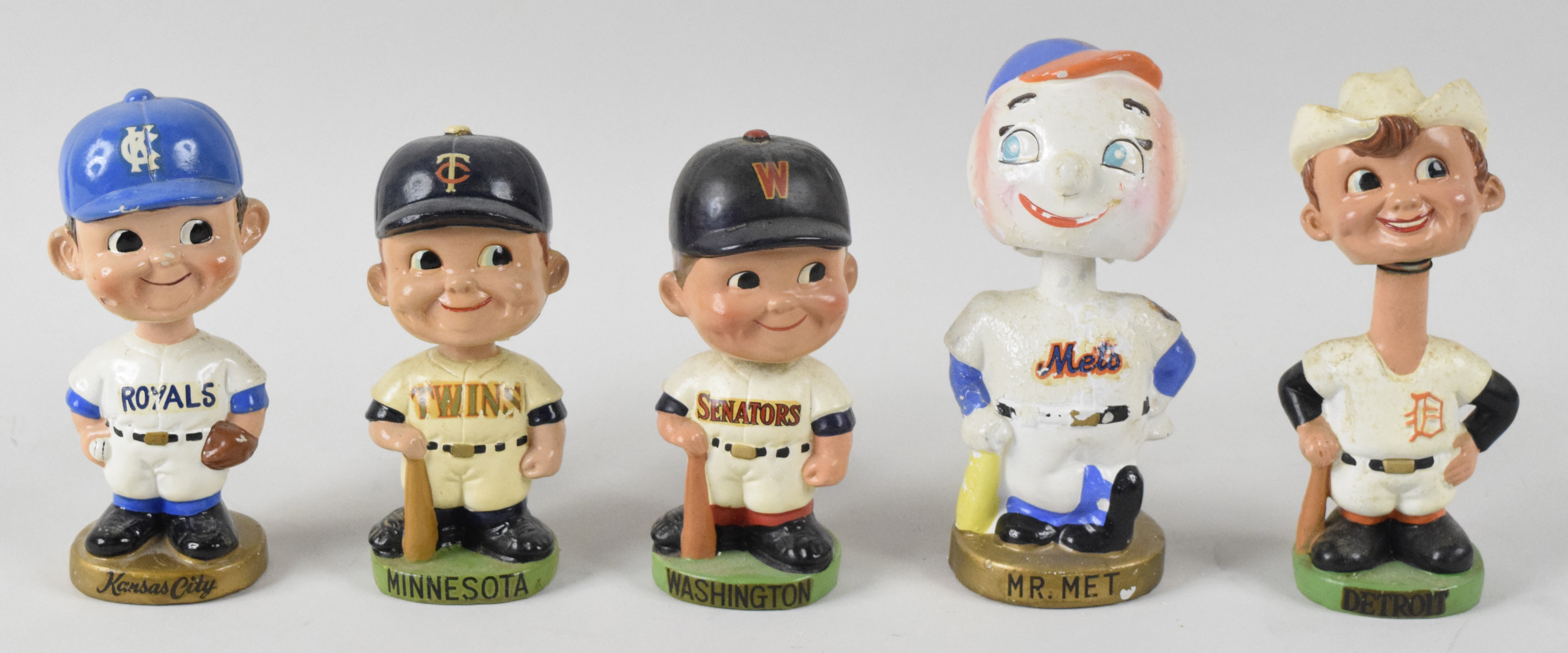 Description:Lot of (5) c.1960s baseball team bobbleheads (PR-EX) Includes Washington Senators (EX); Kansas City Royals (VG); low grade Mr. Met mascot bank; low grade Detroit Tigers; low grade Minnesota Twins. Varying degrees/types of wear throughout: PR-EX