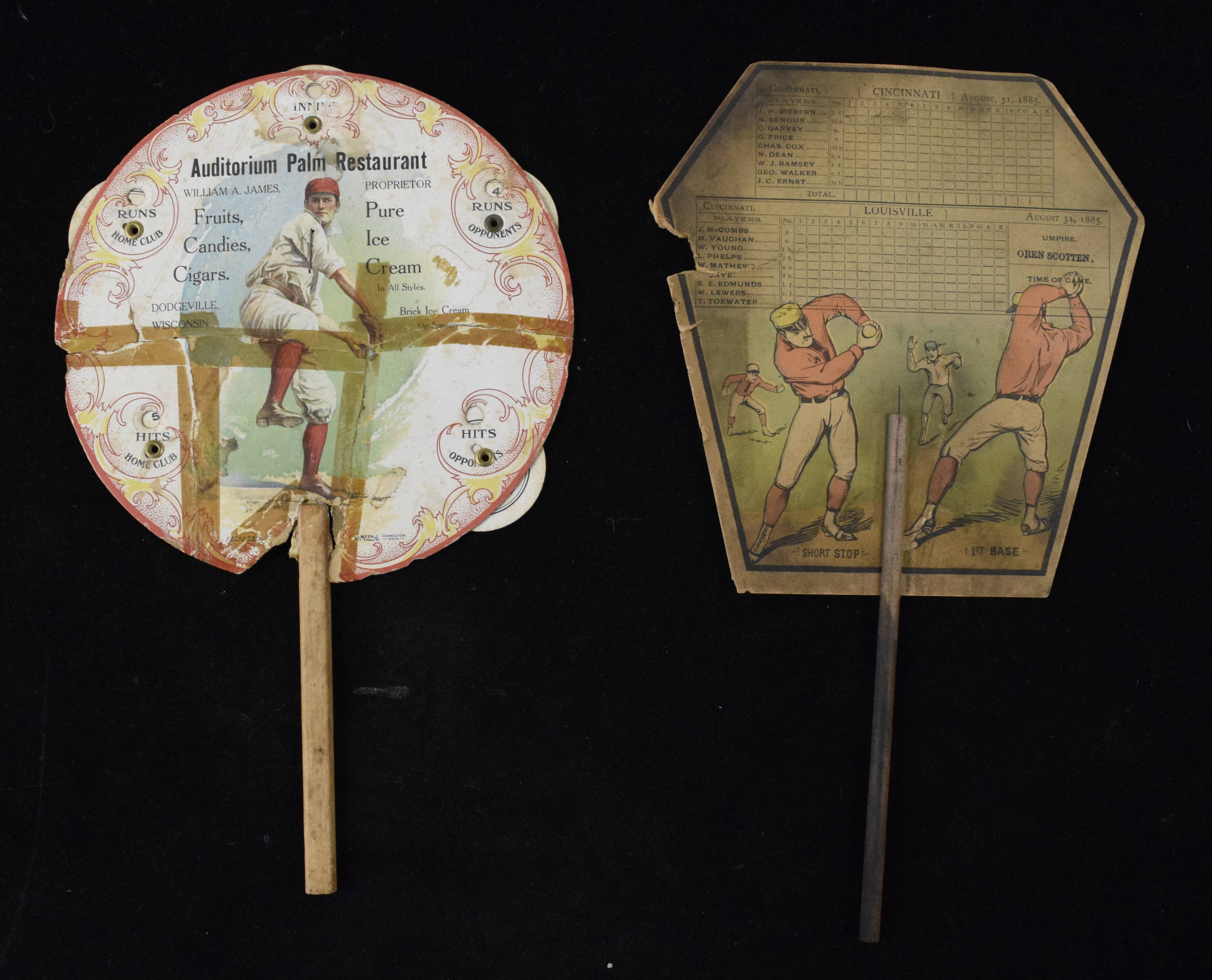 Description:Rare August 31, 1885 Cincinnati vs. Louisville scorecard fan with 1904 scorer fan (PR-FR) Pair of early baseball related pieces including very attractive example which has August 31, 1885 dated printed on the front along with scorecards that could be filled in for a game which featured teams from Cincinnati and Louisville. These do not appear to be players on the Major League rosters and presumably represented Minor League or home town teams. Back has Louisville area business advertising. Toning/discoloration and wear which includes a chip to left side and some small tears; additional baseball themed fan which has scoring wheels incorporated. This piece has major flaws and some stains from where tape/glue was applied: PR-FR