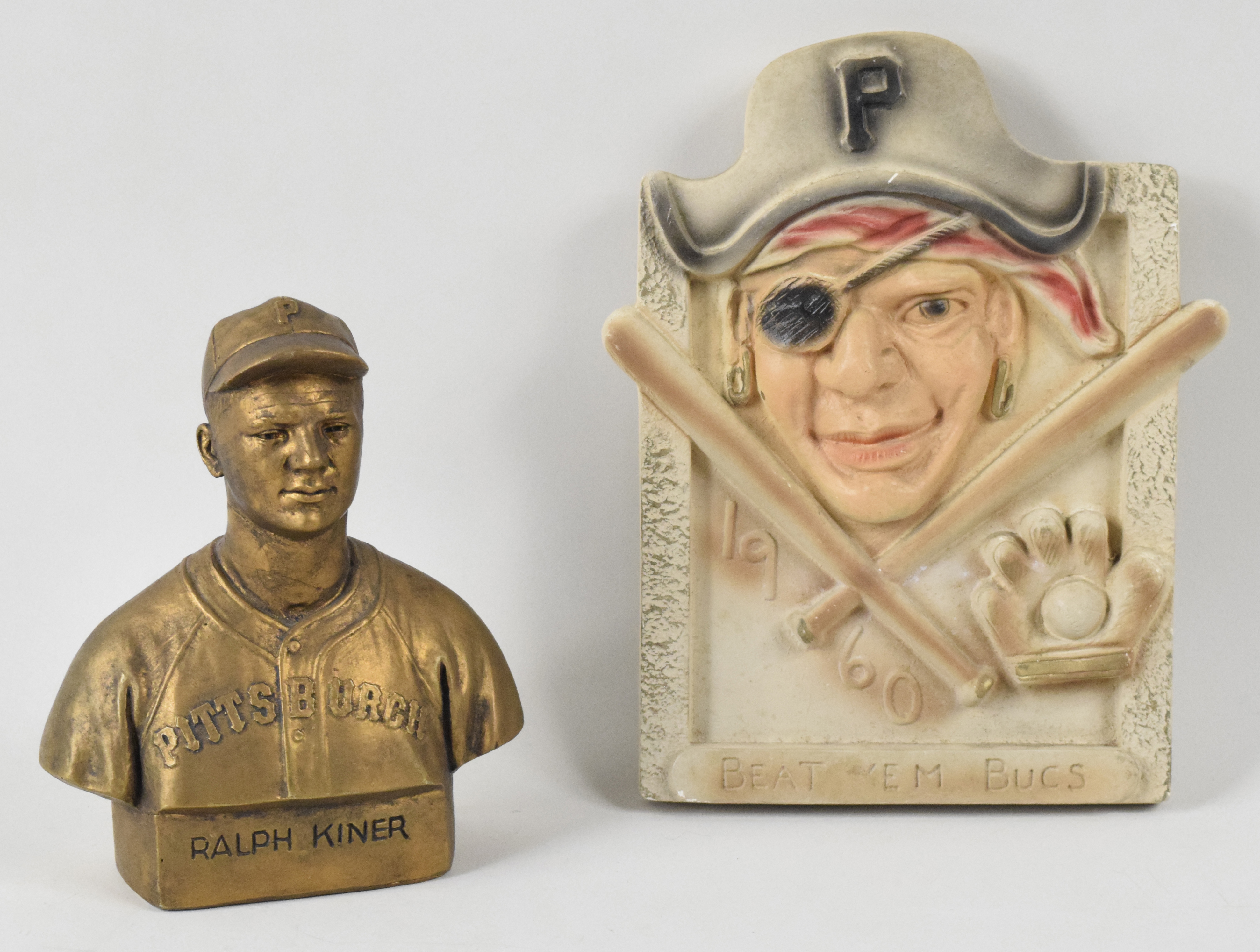Description:Lot of (2) Pittsburgh Pirates related chalkware display pieces (EX-EX/MT) Includes very nicely done Ralph Kiner bust (8" tall) and a 1960 Pirates commemorative wall plaque. Touch of light scattered wear: EX-EX/MT