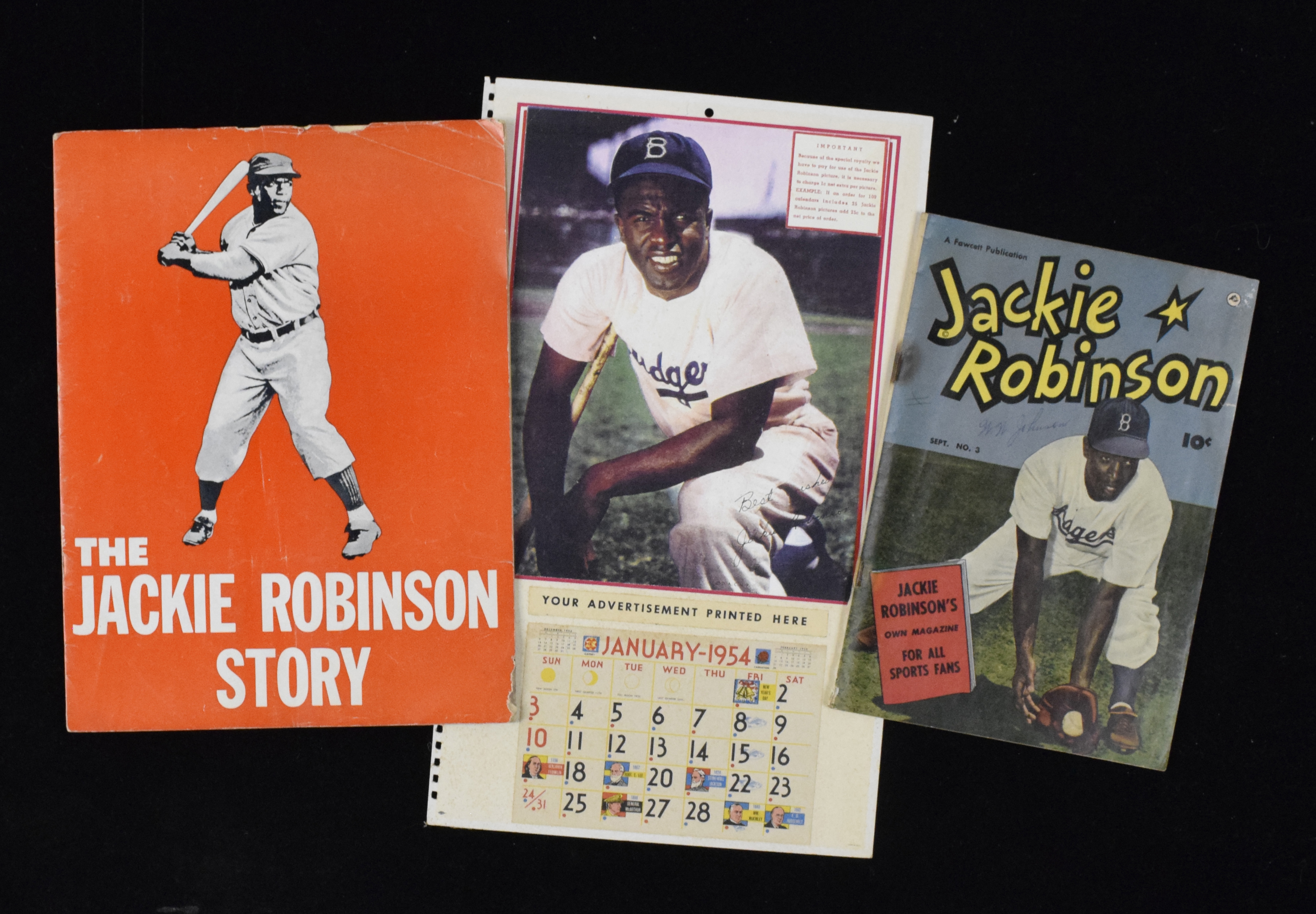 Description:Lot of (3) 1950s Jackie Robinson related pieces (FR/GD-VG) Includes 1950 Fawcett comic #3 (GD); c.1950 Jackie Robinson Story movie program or promotional publication (FR/GD-GD); and 1954 salesmans' sample page done to promote calendars which would feature an image of Robinson (VG). Varying degrees/types of wear throughout: FR/GD-VG