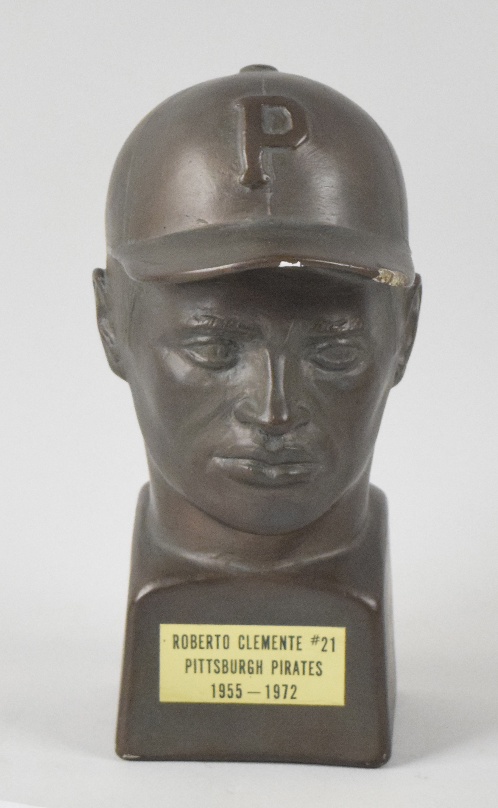 Description:Rare Roberto Clemente figural bust c.1970s (EX) This is the first of this type Clemente bust we can recall seeing or offering in many many years. Very nicely done approx. 8.5" tall bust has a 1970s copyright date impressed on the lower back (final digit can not be deciphered). Light wear including a few nicks/chips to hat brim: EX
