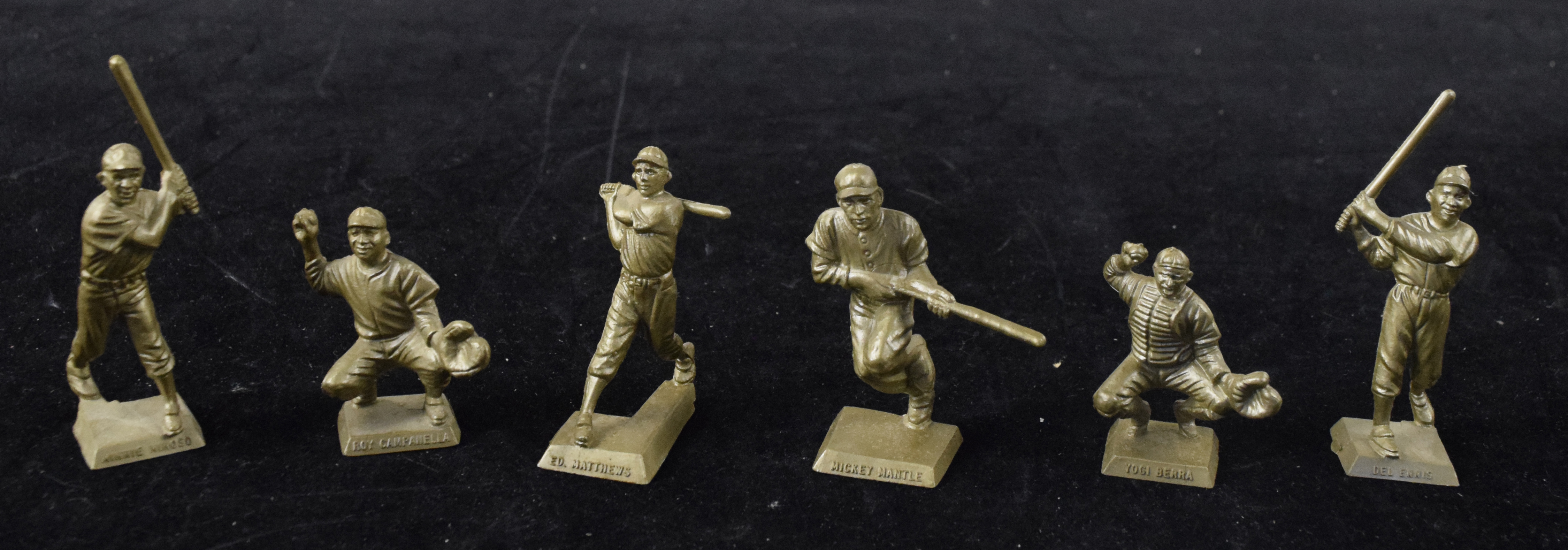 Description:Lot of (6) 1956 Big League Stars statues with Mickey Mantle (EX-EX/MT) Gold colored small figures issued in 1956 including Mickey Mantle, Roy Campanella, Eddie Mathews, Yogi Berra, Del Ennis, and Minnie Minoso. Hint of light wear: EX-EX/MT