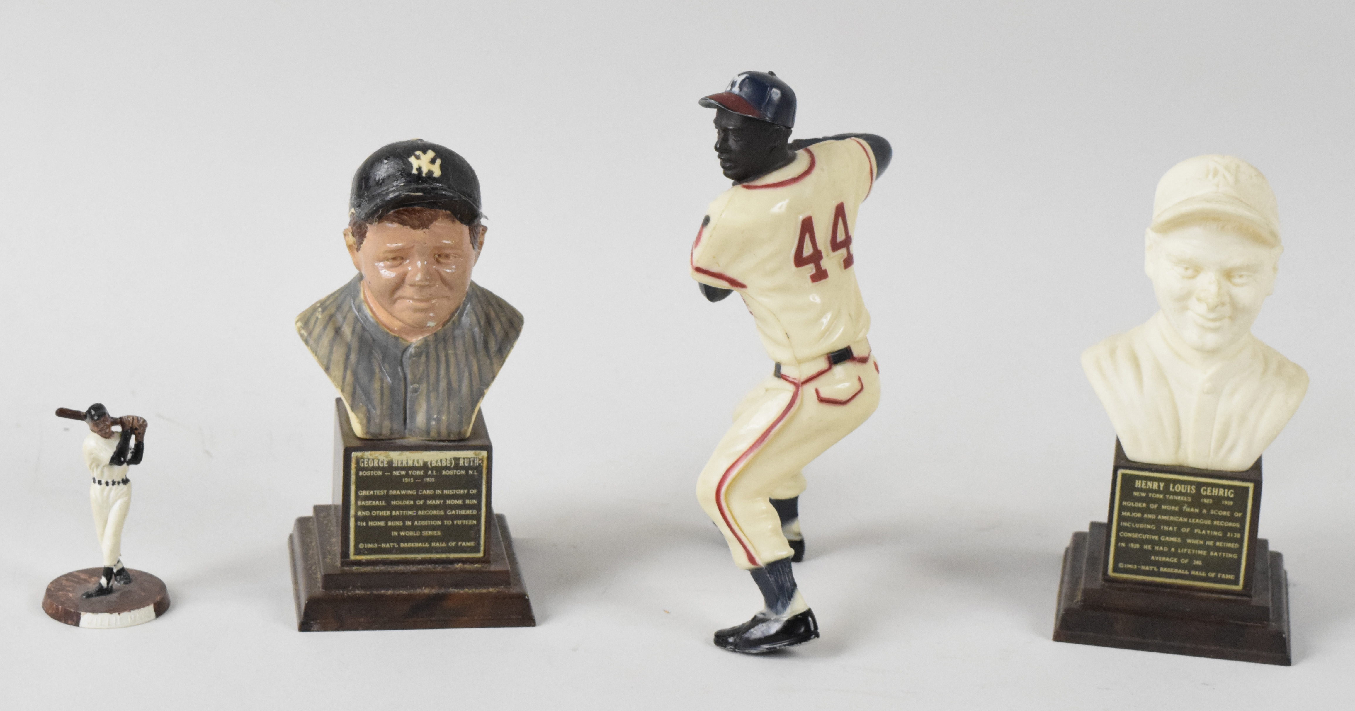 Description:Lot of (15) vintage baseball player figural display pieces (See description) Includes (10) 1955 Robert Gould statues, all but (1) of which has painted applied (some figures are near fully painted, others were started and only have color in 1 or 2 small areas). These include Willie Mays, Jim Finigan, Ernie Banks, Sid Gordon, Joe Coleman, Bob Rush, Smokey Burgess, Bill Bruton (no paint), Jim Busby, and Don Mueller; c.1958-62 Hank Aaron Hartland statue (missing bat, does not stand freely); 1963 Hall of Fame bust of Lou Gehrig (EX) and additional busts which have been painted of Babe Ruth, Joe DiMaggio, and Bill Dickey (note - the paint is tacky and there is material stuck to surfaces). Nearly all pieces fall at lower end of grading scale due to the application of paint (and there is additional wear): See description