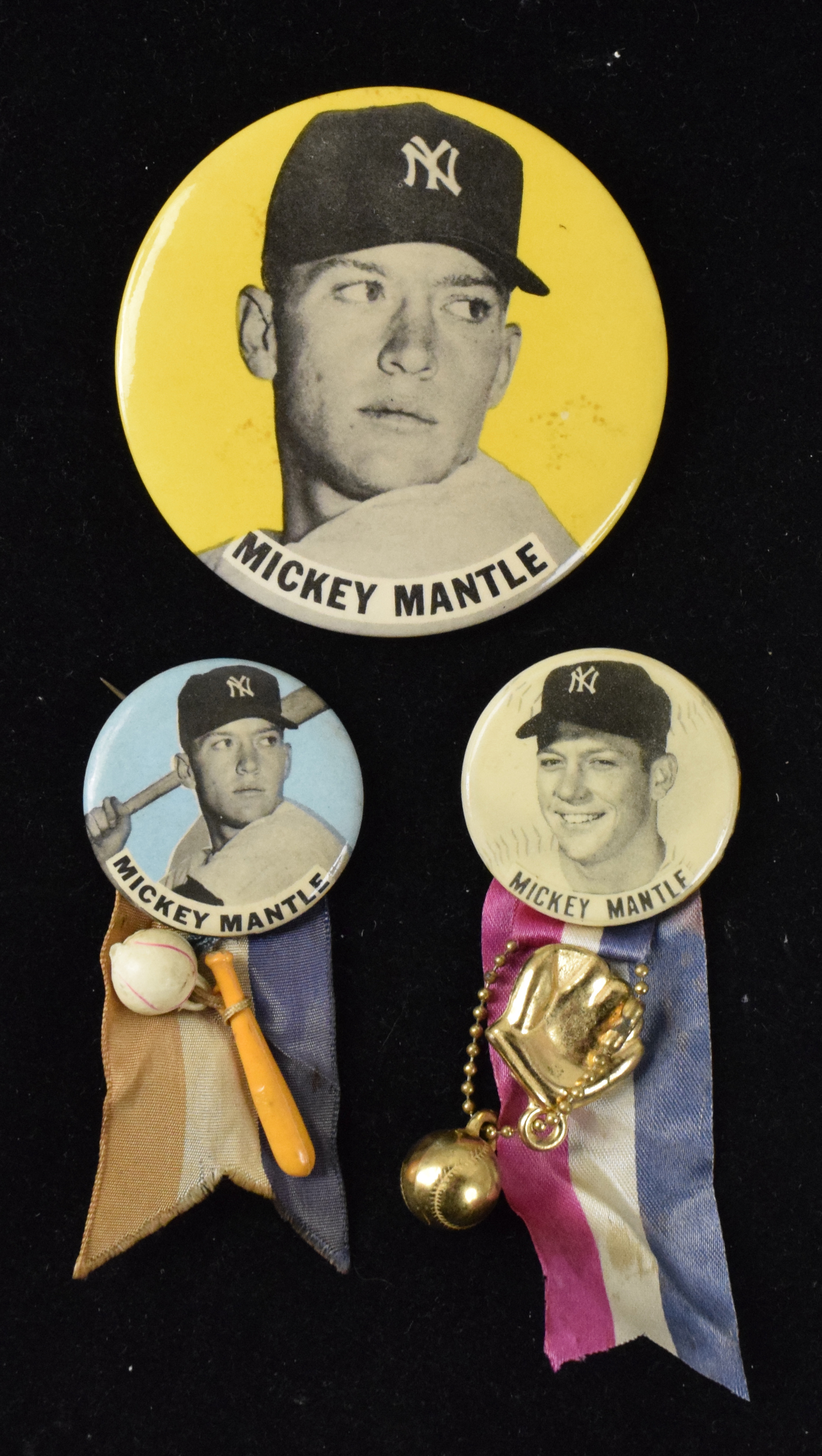 Description:Lot of (3) c.1950s-60s Mickey Mantle souvenir pins (EX-EX/MT) Trio of pieces with the largest measuring 3.5" across and the two smaller have ribbons and charms affixed. Light to mild general age and handling wear: EX-EX/MT