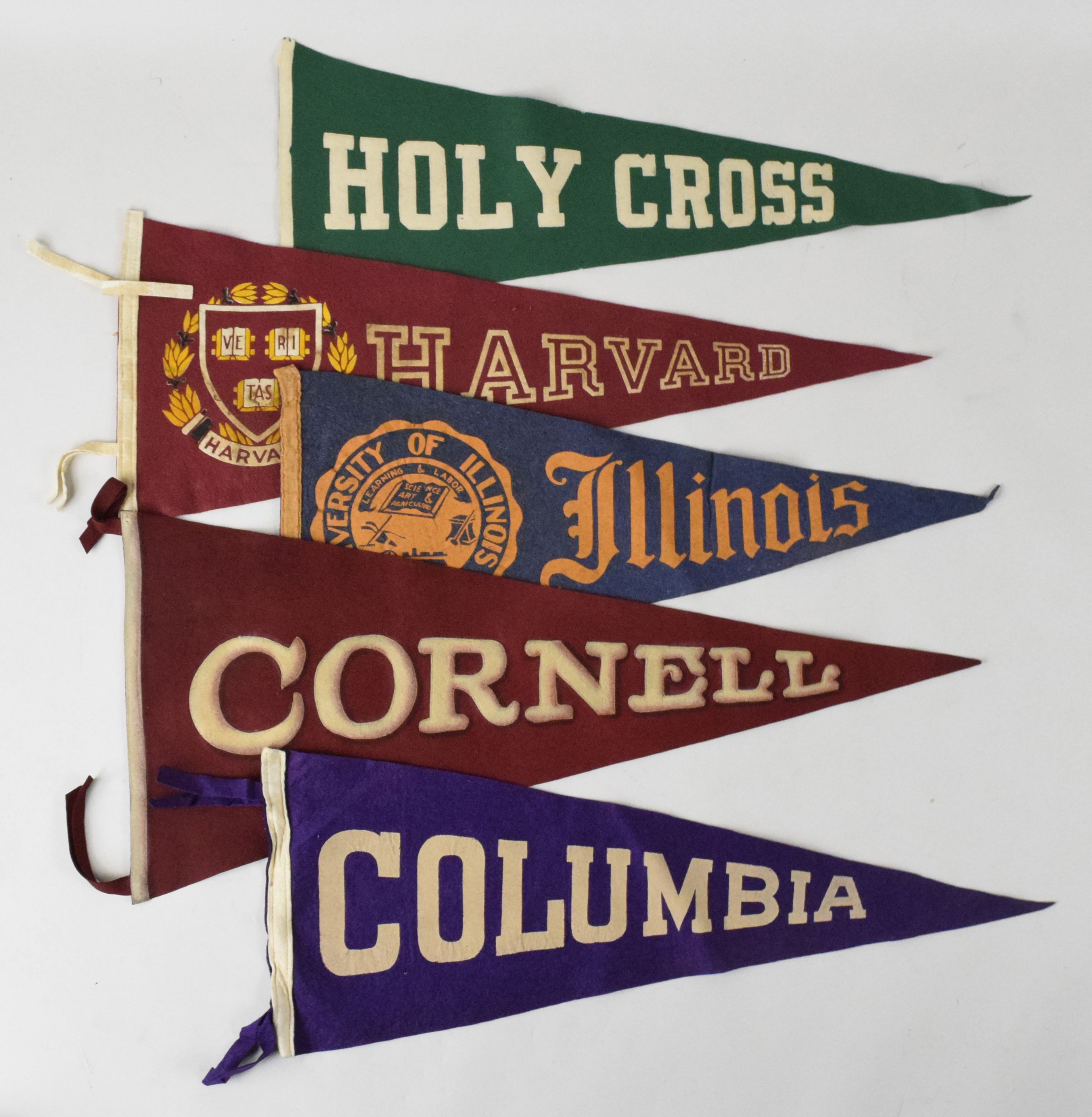Description:Lot of (12) vintage college related pennants including Ivy League (GD-EX) Includes pieces related to Cornell, Harvard, Dartmouth, University of Alabama, University of Illinois, Columbia, California Bears, Lehigh, University of Kentucky, Holy Cross, Ohio Wesleyan, and Texas A&M. Varying degrees/types of wear throughout with some more notably effected than others: GD-EX