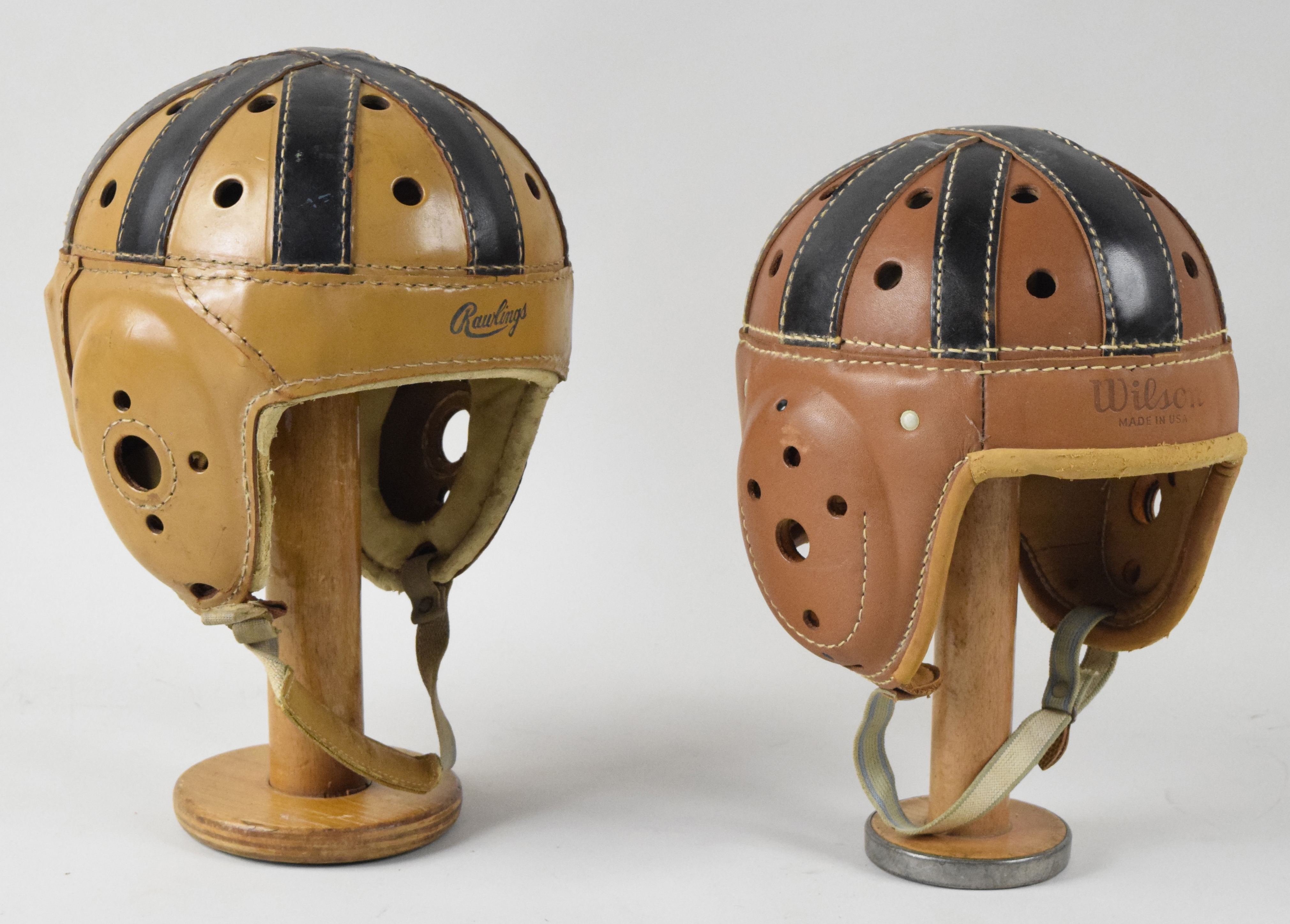 Description:High grade Rawlings and Wilson football helmets c.1950s-60s (EX/MT-NM) Very sharp pair of helmets which appears to be "new old stock" with little to no evident use. The Rawlings (model "15") has some slightly more pronounced surface flaws (notably on the back): EX/MT-NM