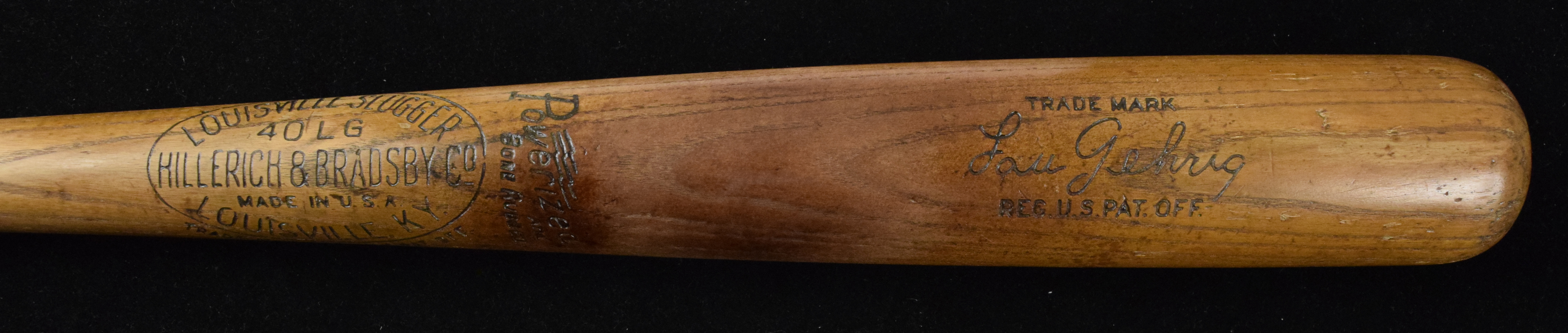 Description:Lou Gehrig store model Louisville Slugger baseball bat c.1930s (EX) Wooden bat with (34) inch mark in the handle has bold and well defined Gehrig facsimile signature and model "40LG" markings. Uncraked with some minor use and storage wear. Surface finish is a touch irrugular between the centerbrand and other impressed stampings: EX