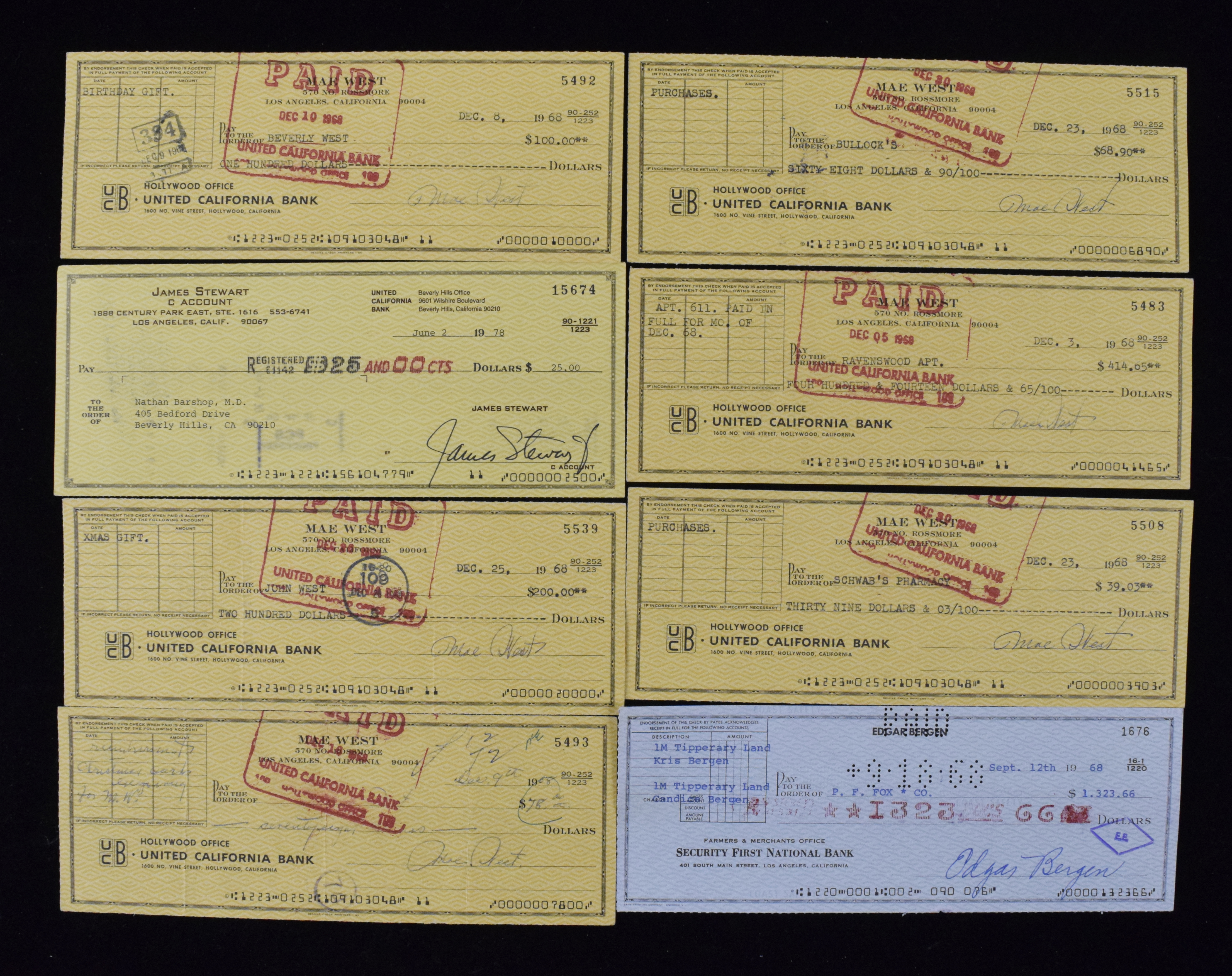Description:Lot of (9) noted entertainer signed checks incl. Jimmy Stewart (EX-NM) Includes Jimmy Stewart, (6) Mae West, and (2) Edgar Bergen. Signatures rate 7 to 9 out of 10. Typically bank cancellations and mild to moderate handling wear: EX-NM