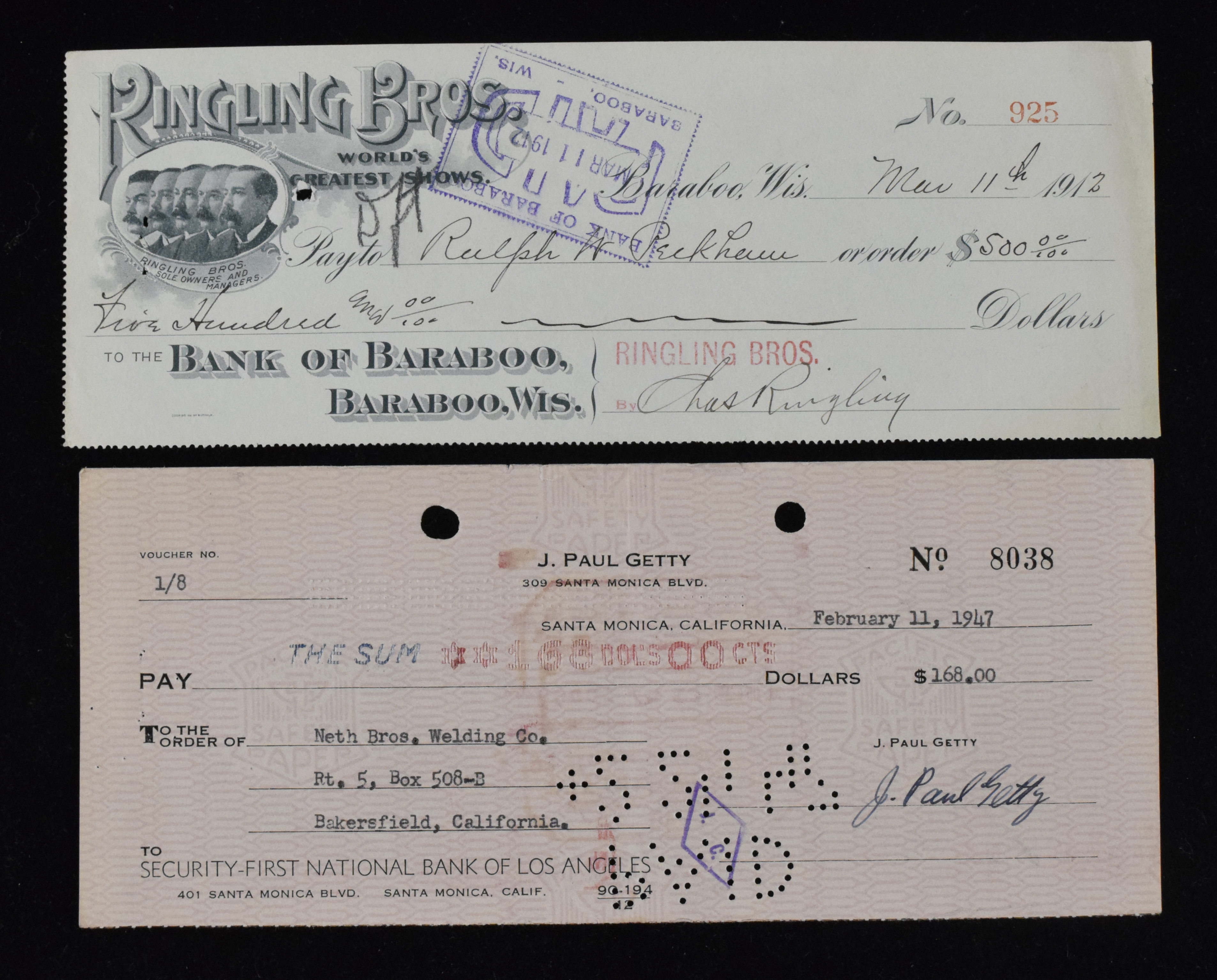 Description:Charles Ringling and J.Paul Getty autographed checks (EX-NM) Includes 1912 dated Ringling Bros. check signed by Charles Ringling and 1947 personal check signed by J. Paul Getty. Signatures rate 8 out of 10 and there are typical bank cancellations and mild handling wear: EX-NM