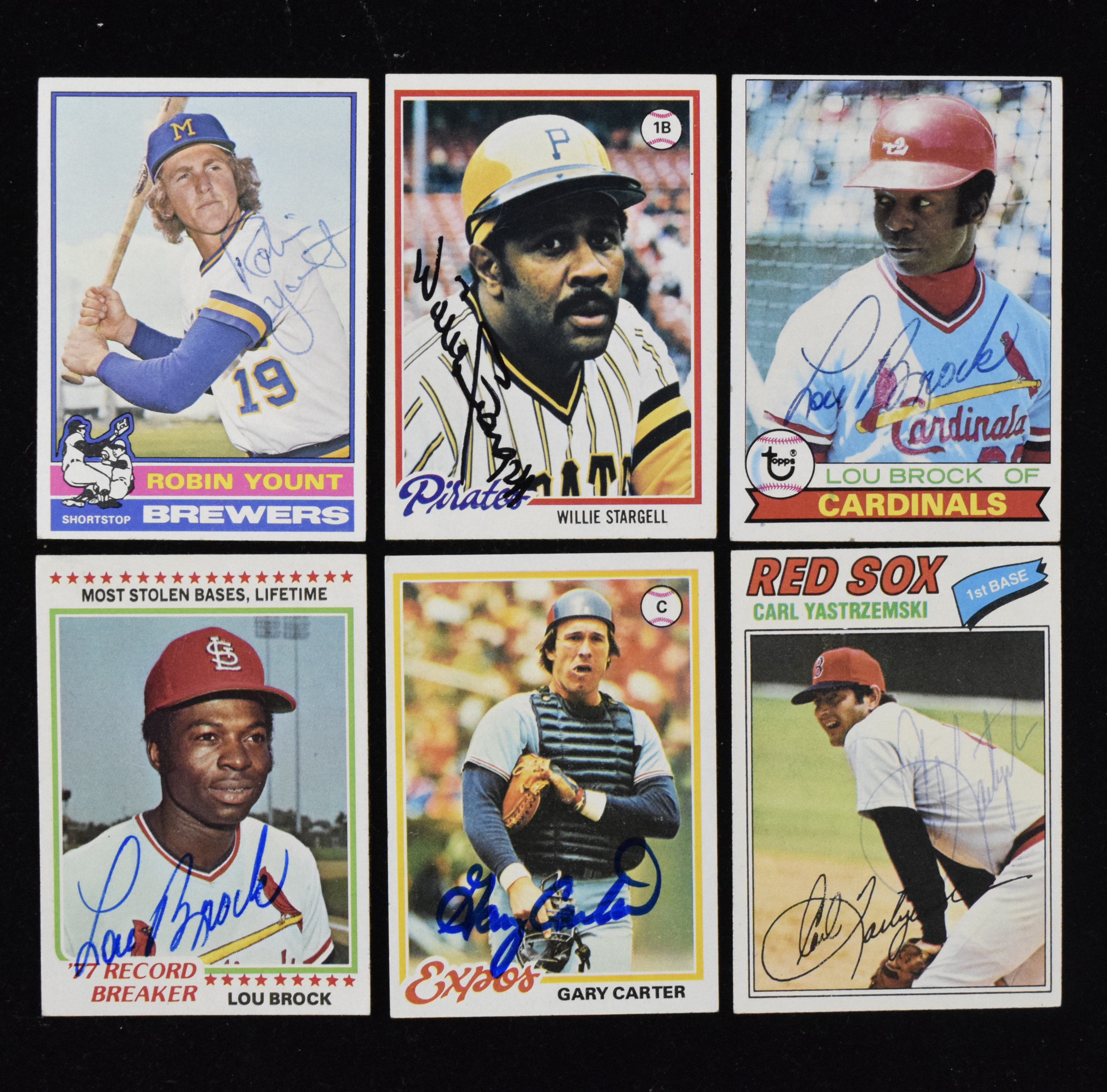 Description:Lot of (14) 1976-1979 Baseball Hall of Famer autographed Topps cards (Sigs. VG-NM, Cards VG-EX/MT) Includes 1976 Topps Robin Yount, Billy Williams, Joe Morgan, and Gaylord Perry; 1977 Topps Brooks Robinson, Carl Yastrzemski, and Gaylord Perry; 1978 Topps Lou Brock (record breaker), Willie Stargell, Gary Carter, and Rollie Fingers; 1979 Topps Joe Morgan, Lou Brock, and Catfish Hunter. Signatures rate 7 to 9 out of 10. Varying degrees of mostly light wear to cards: Sigs. VG-NM, Cards VG-EX/MT