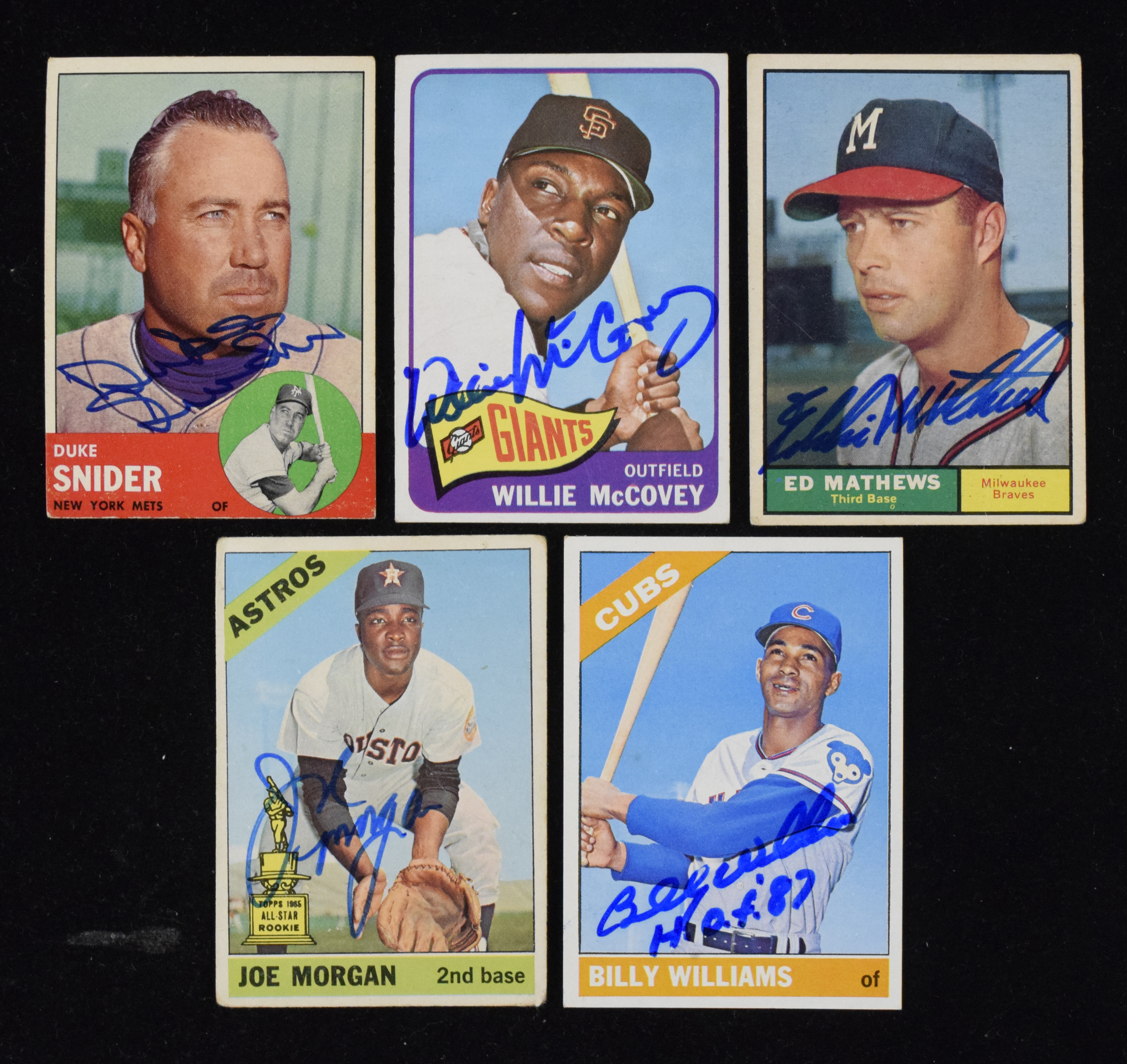 Description:Lot of (14) 1961-1966 Baseball Hall of Famer autographed Topps cards (Sigs. VG-NM, Cards GD-EX) Includes 1961 Topps Eddie Mathews; 1962 Topps Warren Spahn; 1963 Topps Richie Ashburn, Duke Snider, and Billy Williams; 1964 Topps Brooks Robinson, Harmon Killebrew, and Warren Spahn; 1965 Topps Willie McCovey and Waren Spahn; 1966 Topps Juan Marichal, Jim Bunning, Billy Willams, and Joe Morgan. Signatures rate 7 to 9 out of 10. Varying degrees of mostly light wear to cards: Sigs. VG-NM, Cards GD-EX