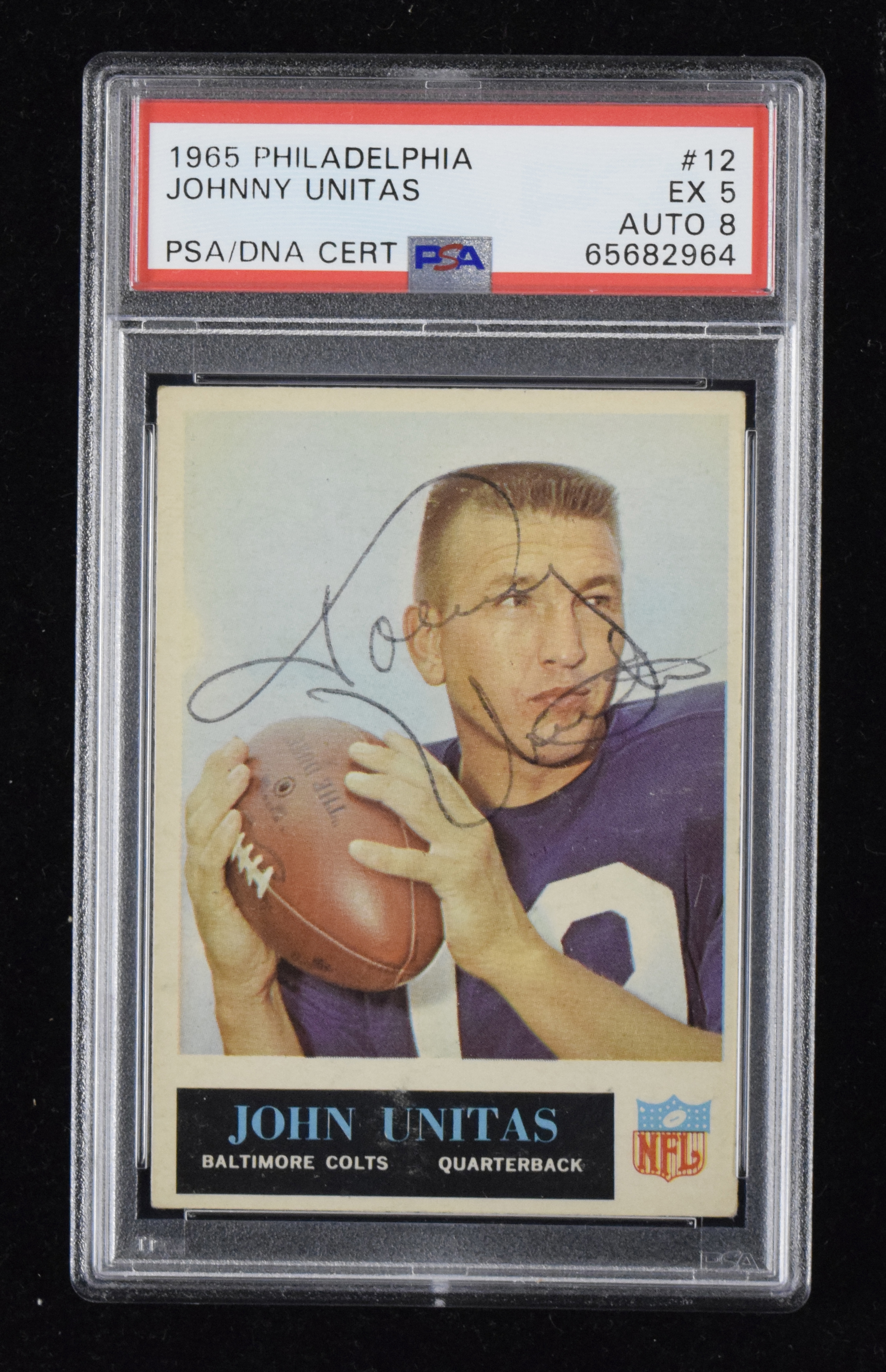 Description:1965 Philadelphia #12 Johnny Unitas autographed card - only (1) graded higher (PSA EX 5, 8 auto) Only one autographed example is listed as grading higher in the PSA pop report: PSA EX 5 with 8 auto