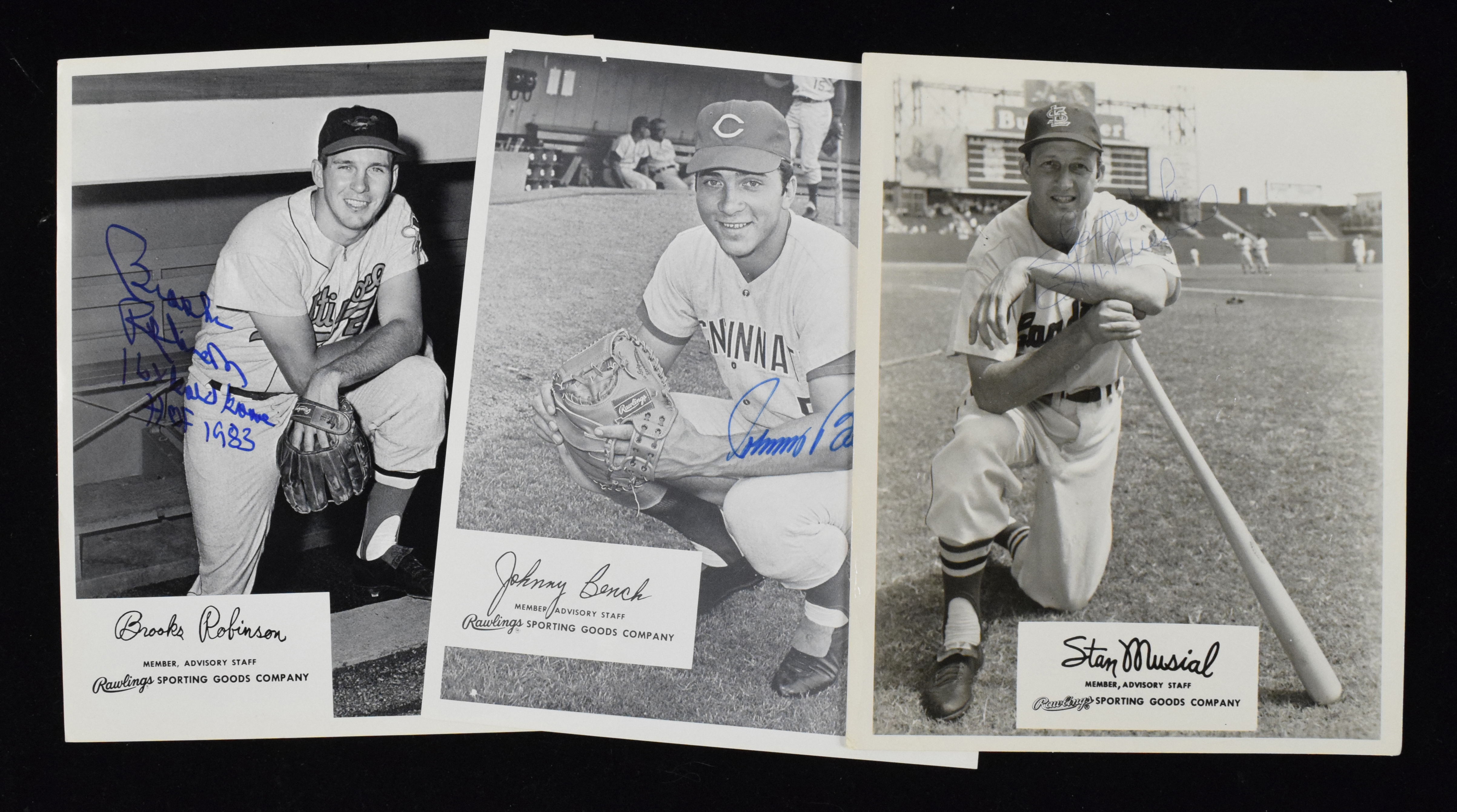 Description:Lot of (3) Hall of Famer autographed vintage Rawlings Advisory Staff 8"x10" photos (Sigs. EX/MT-NM, Photos GD-EX/MT) Very nice trio including Stan Musial, Johnny Bench, and Brooks Robinson. Signatures rate 7 to 8/9 out of 10. Wear to Musial (GD), others are clean. Musial includes JSA COA: Sigs. EX/MT-NM, Photos GD-EX/MT