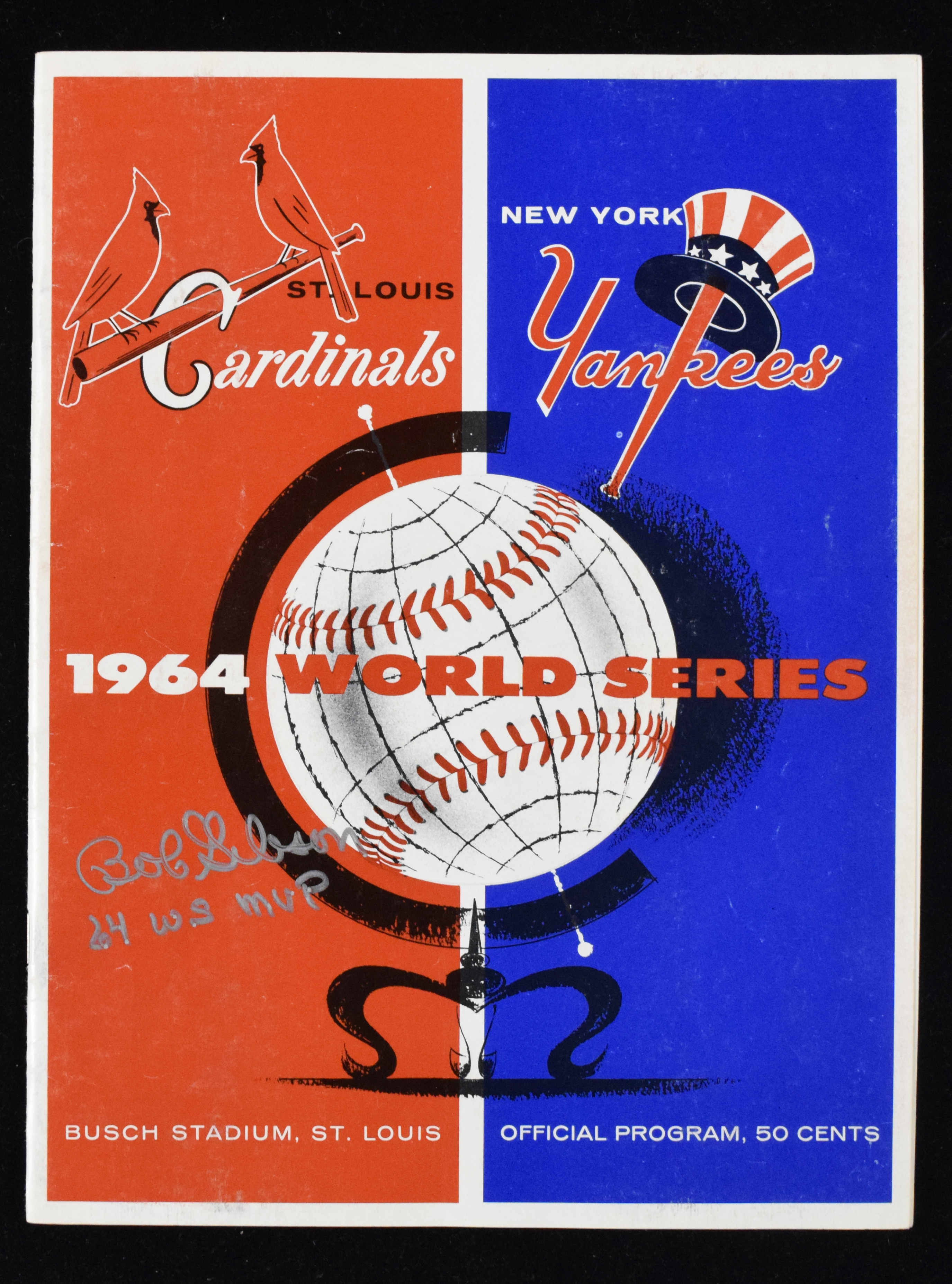 Description:Bob Gibson signed and inscribed 1964 World Series program (EX/MT). Gibson signed the cover in silver marker and added "64 WS MVP" inscription. Signature rates 9 out of 10: EX/MT