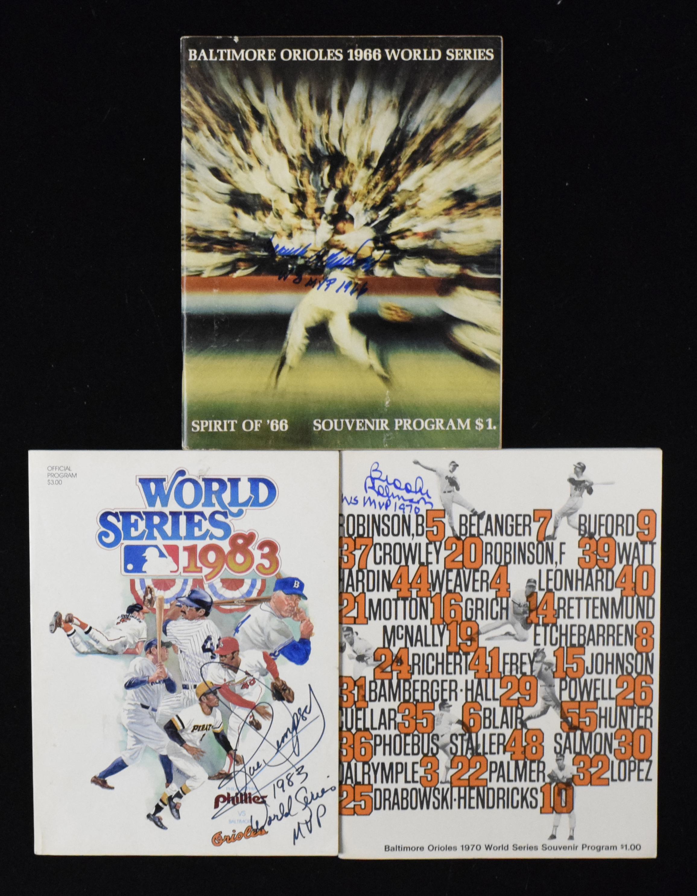 Description:Brooks Robinson, Frank Robinson, and Rick Dempsey signed & inscribed World Series programs (EX-NM). Includes 1966 World Series program signed by Frank Robinson with "WS MVP 1966" inscription (EX), 1970 World Series program signed by Brooks Robinson with "WS MVP 1970" inscription (NM), and 1983 World Series program signed by Rick Dempsey with "1983 World Series MVP" inscription (EX). Signatures rate 8/9 to 10 out of 10: EX-NM