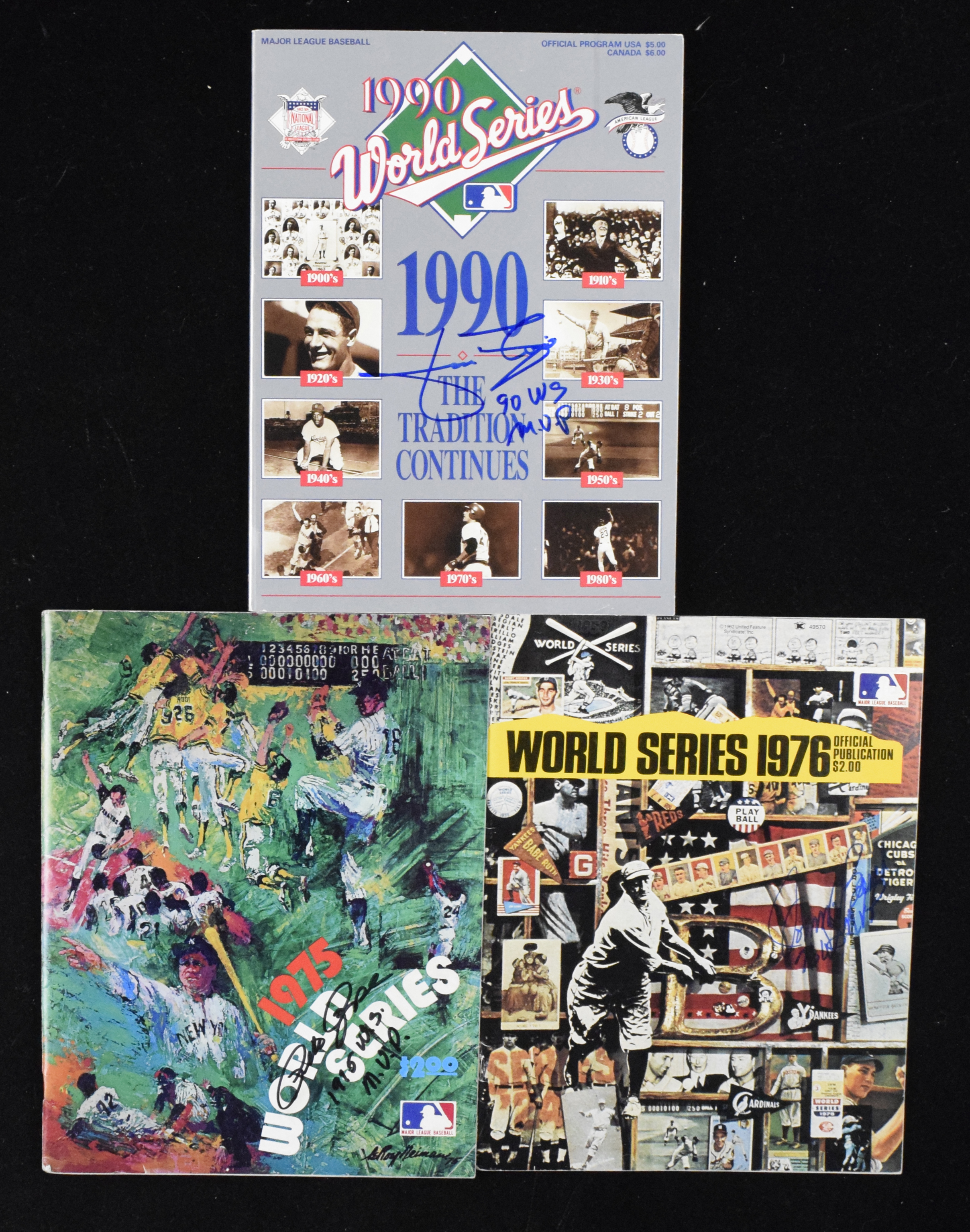 Description:Johnny Bench, Pete Rose, and Jose Rijo signed & inscribed World Series programs (EX-NM). Includes 1975 World Series program signed by Pete Rose with "1975 WS MVP" inscription, 1976 World Series program signed by Johnny Bench with "76 WS MVP" inscription, and 1990 World Series program signed by Jose Rijo with "90 WS MVP" inscription. Signatures rate 8/9 to 10 out of 10: EX-NM