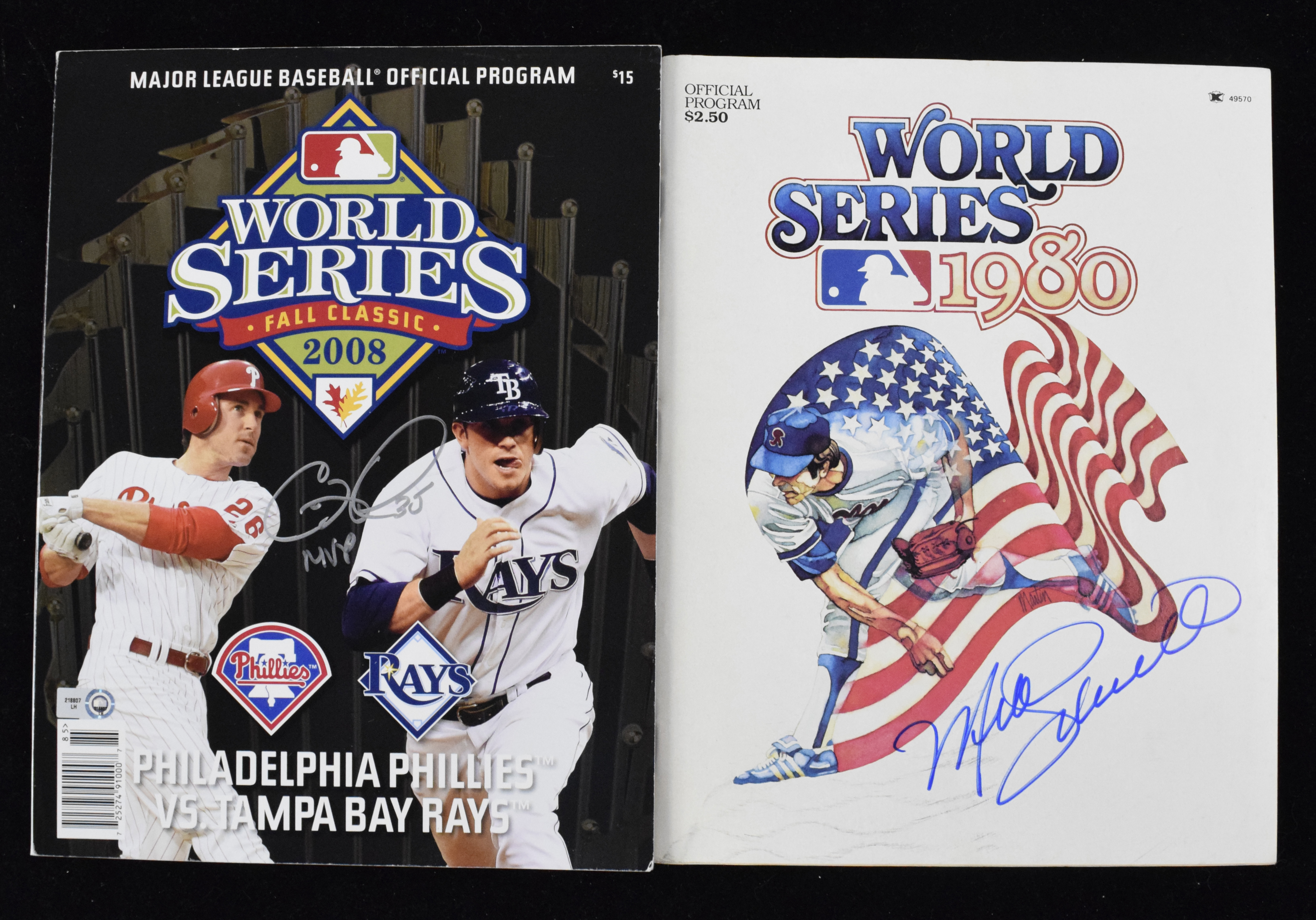 Description:Mike Schmidt and Cole Hamels signed World Series programs (EX-NM). Includes 1980 World Series program signed by Mike Schmidt (EX), and 2008 World Series program signed by Cole Hamels with "MVP" inscription (MLB Authenticated). Signatures rate 9 to 10 out of 10: EX-NM