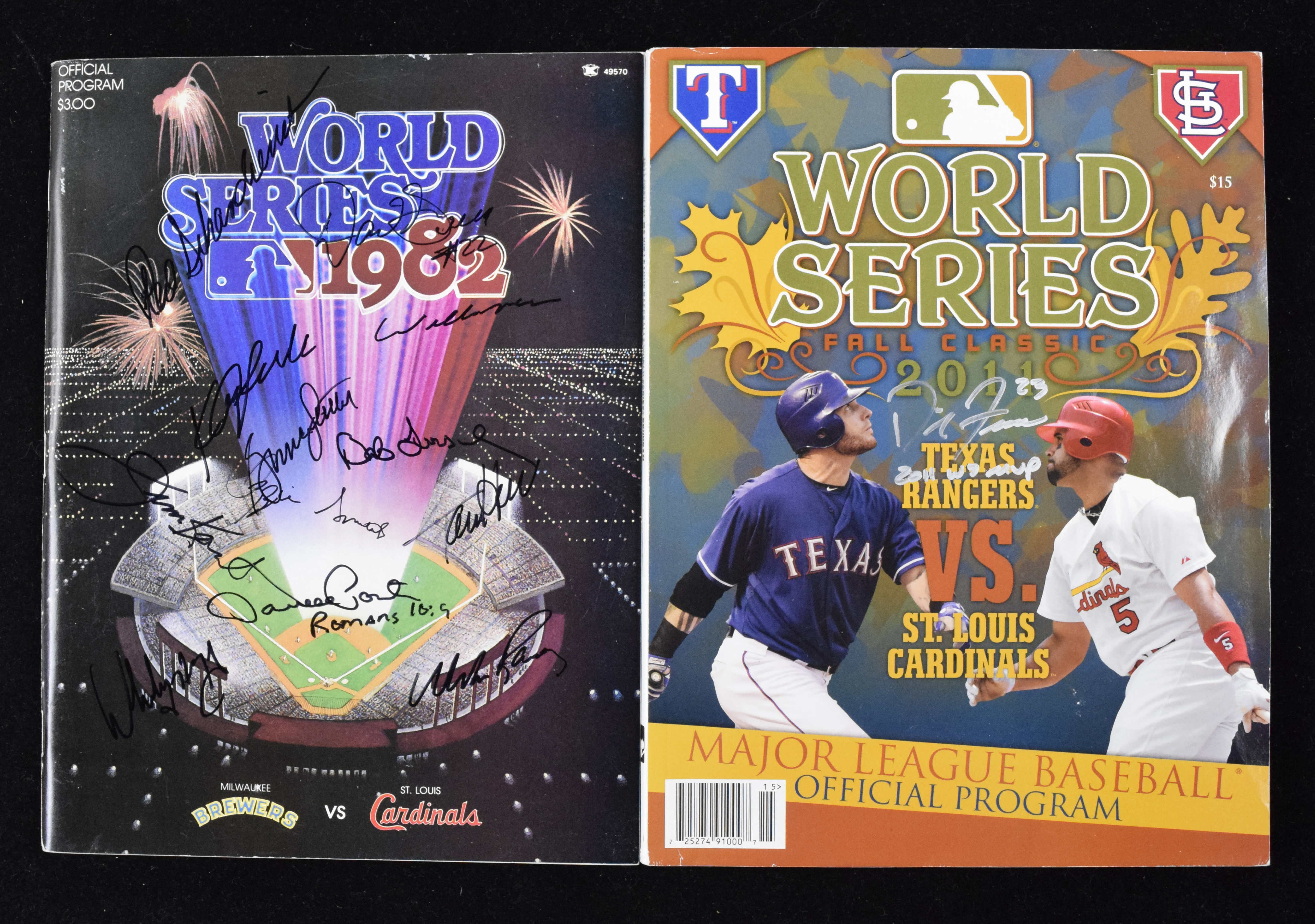 Description:St. Louis Cardinals multi-signed 1982 World Series program & David Freese signed 2011 WS program (EX-NM). Includes 1982 World Series program signed by (12): Whitey Herzog, Red Schoendienst, Bruce Sutter, Ozzie Smith, Jim Kaat, Darrell Porter, Willie McGee, Bob Forsch, Tom Herr, Ken Oberkfell, David Green, and Mike Ramsey (EX-EX/MT); and 2011 World Series program signed by David Freese with "2011 WS MVP" inscription (NM). Signatures rate 8 to 10 out of 10: EX-NM