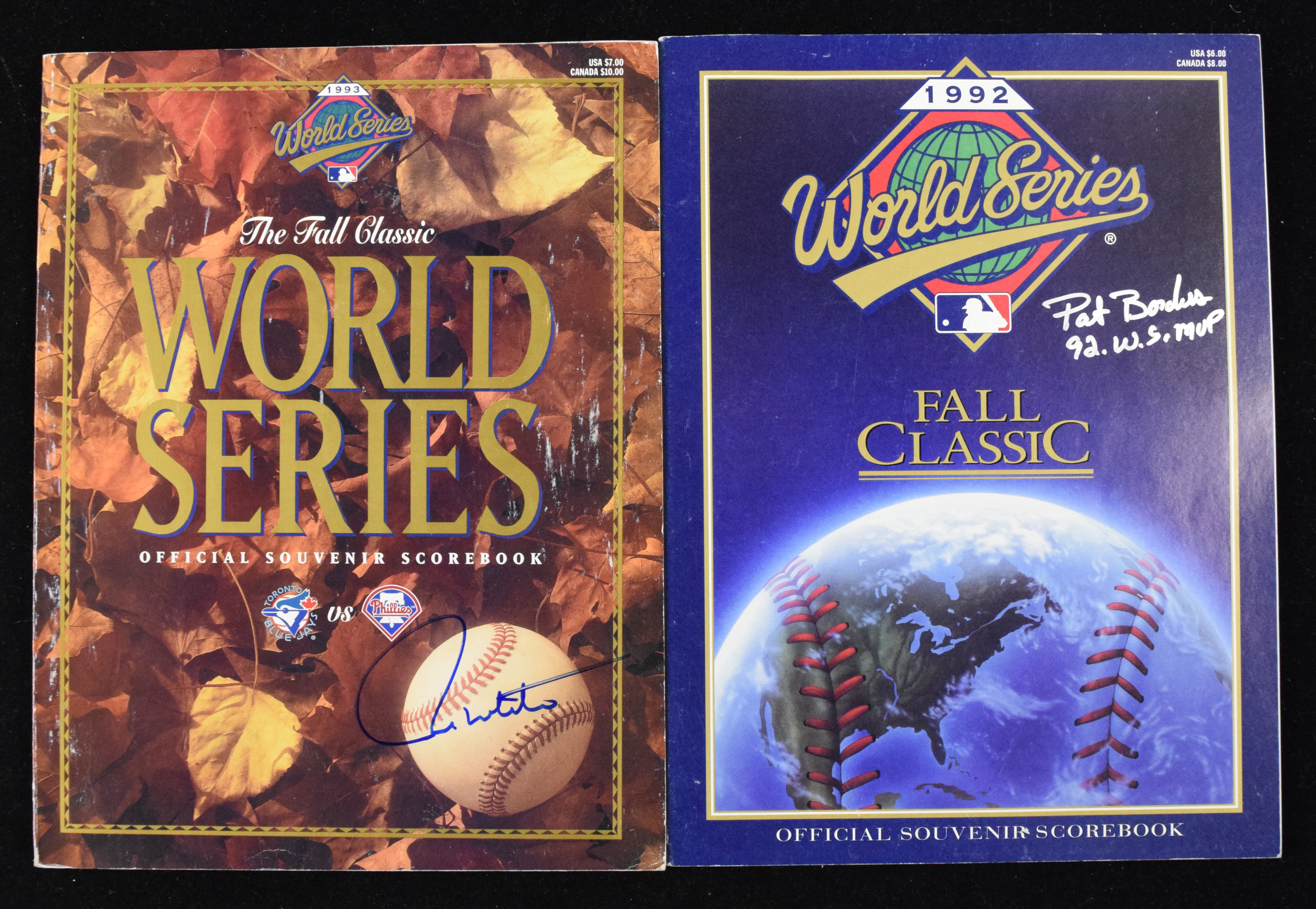 Description:Paul Molitor and Pat Borders signed World Series programs (EX-NM). Includes 1992 World Series program signed by Pat Borders with "92 WS MVP" inscription (NM), and 1993 World Series program signed by Paul Molitor (EX). Signatures rate 9 to 10 out of 10: EX-NM