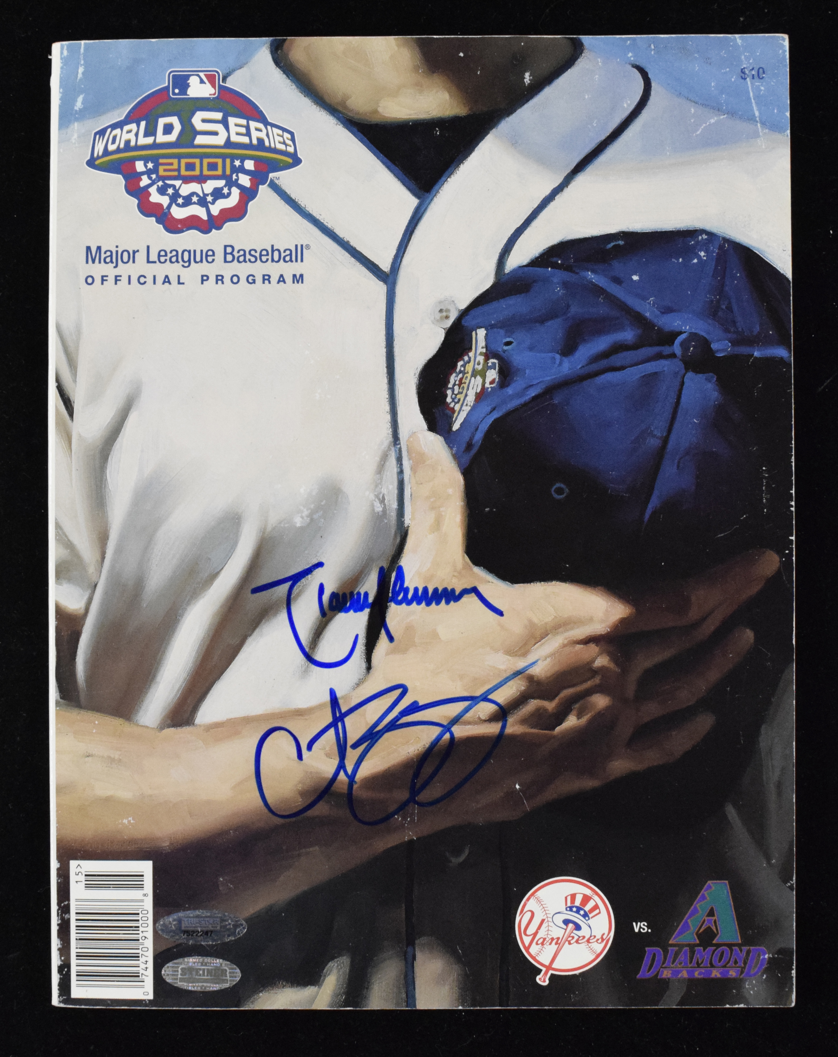 Description:Randy Johnson & Curt Schilling dual-signed 2001 World Series program - Steiner & Tri-Star (EX). Johnson and Schilling both signed the cover in blue marker. Signatures rate 9 to 10 out of 10. Tri-Star and Steiner hologram stickers are on the cover. Areas of light to moderate cover wear: EX