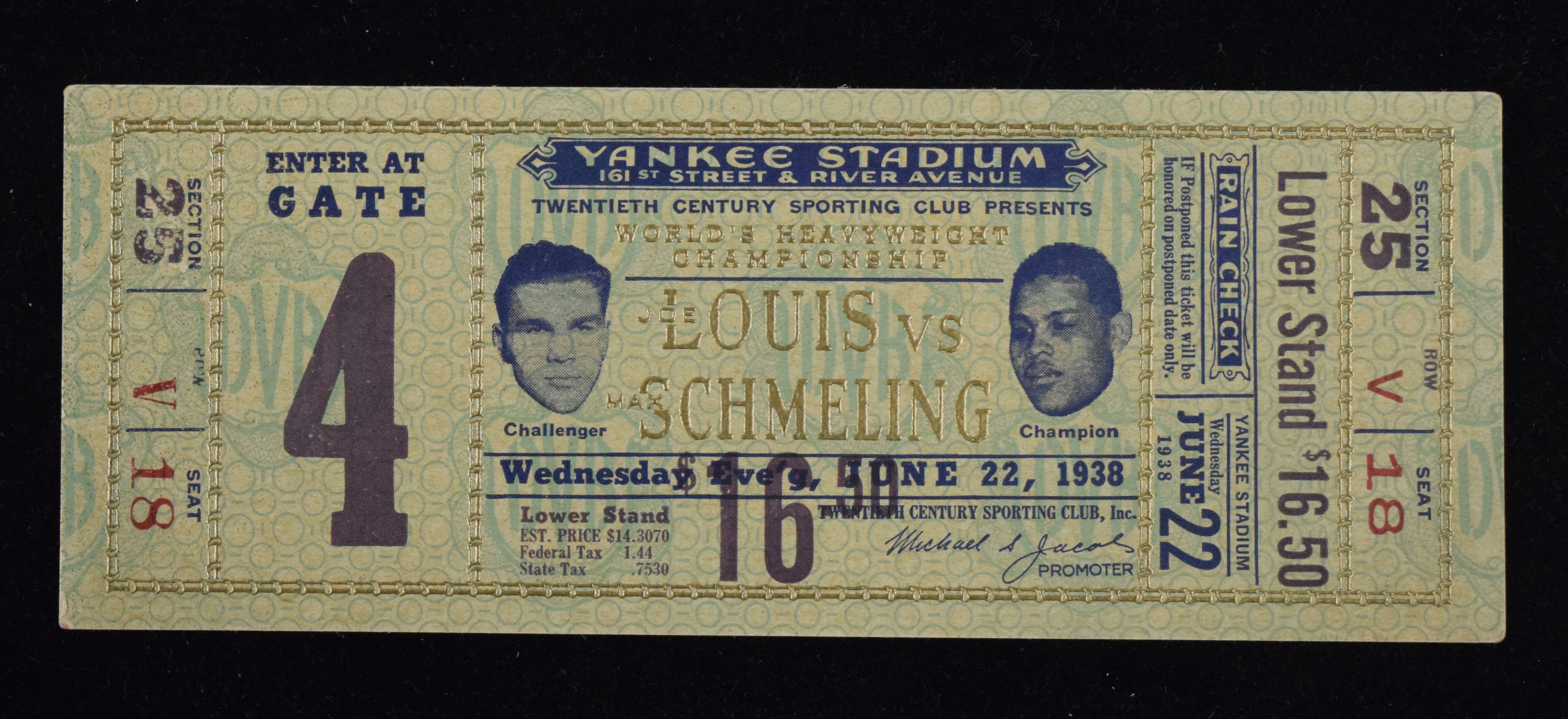 Description:1938 Joe Louis vs. Max Schmeling full ticket (foil embossed "Lower Stand" version) (EX) Rare unused ticket issued for the fight at Yankee Stadium was for a high priced "Lower Stand" seat and has gold foil embossing. Outstanding condition with a touch to each corner. The print on the section number on left side has a hint of loss (or more likely did not adhere well at the time of printing): EX ($750-$1,250)