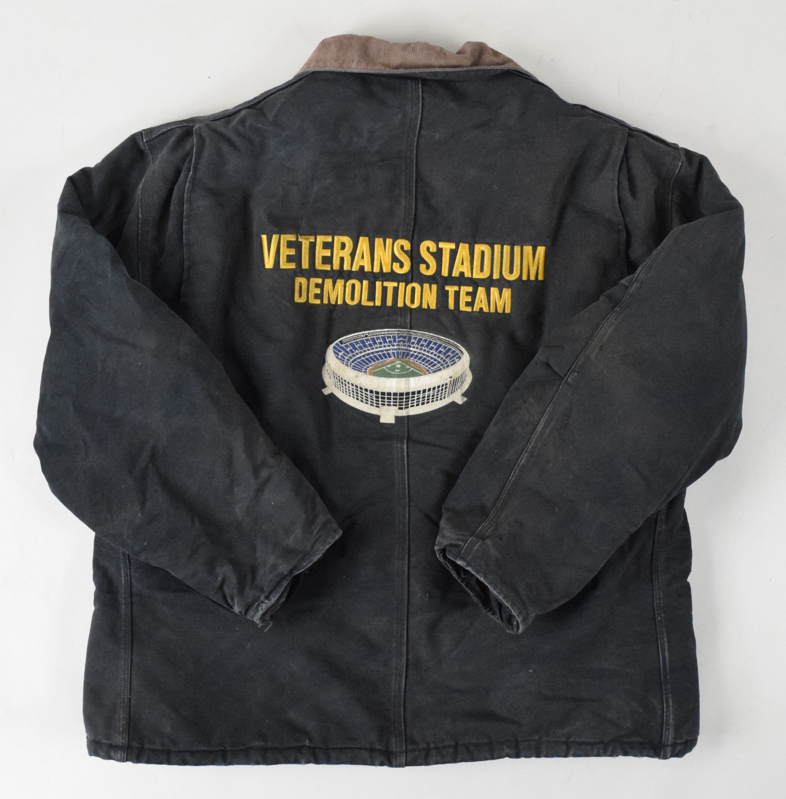 Description:Veterans Stadium Demolition Team jacket (EX). Carhartt brand heavy jacket with "Driscoll Hunt In Association with Synterra/Todd" logo on the front, and "VETERANS STADIUM DEMOLITION TEAM" embroidered on the back above an image of the stadium: EX