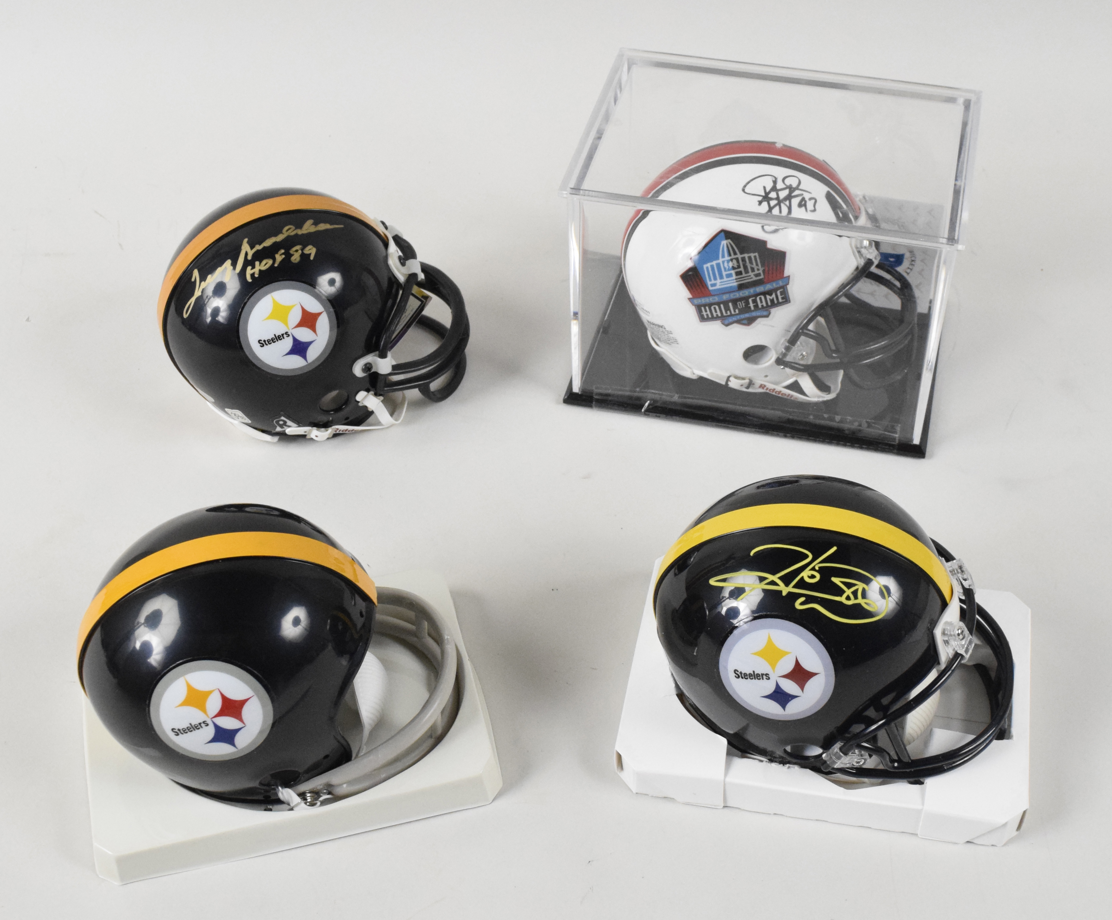 Description:Terry Bradshaw, Troy Polamalu, and Hines Ward signed mini helmets plus Rocky Bleier signed baseball (EX-NM/MT). Includes a Pittsburgh Steelers mini helmet signed by Terry Bradshaw with "HOF 89" inscription (Tri-Star), Football HOF mini helmet signed by Troy Polamalu (Beckett), Steelers mini helmet signed by Hines Ward (Beckett), and W.White NL baseball (toning) signed by Rocky Bleier (Beckett). Signatures rate 7 (Polamalu) to 9/10 (avg 8/9) out of 10. Also includes an unsigned Steelers mini helmet: EX-NM/MT