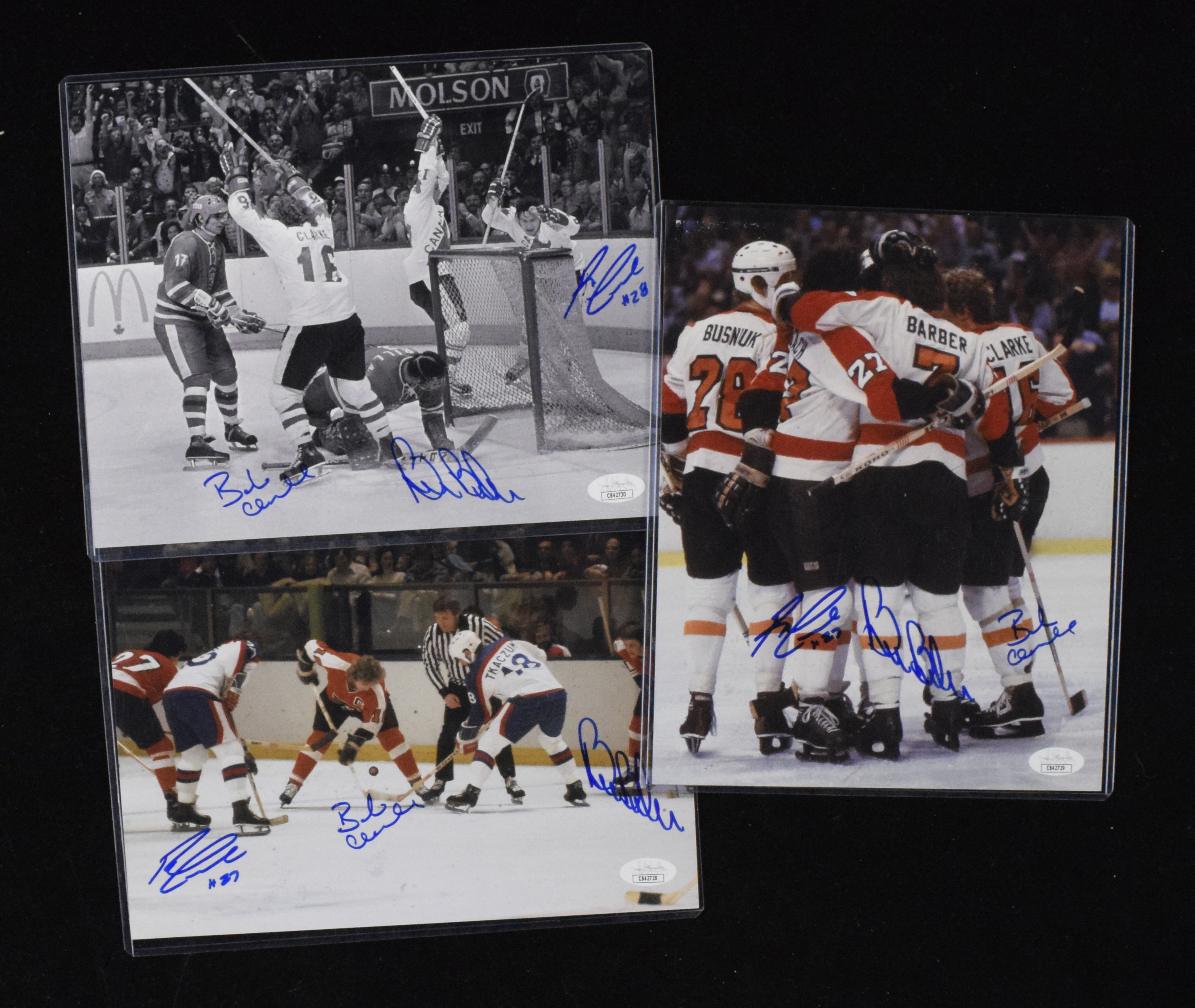 Description:Lot of (3) Bobby Clarke, Bill Barber, and Reggie Leach multi-signed 8"x10" photos - JSA (NM-NM/MT). All three signed each photo in blue marker. Signatures rate 8/9 to 10 out of 10. JSA serial #ed sticker is on each photo: NM-NM/MT