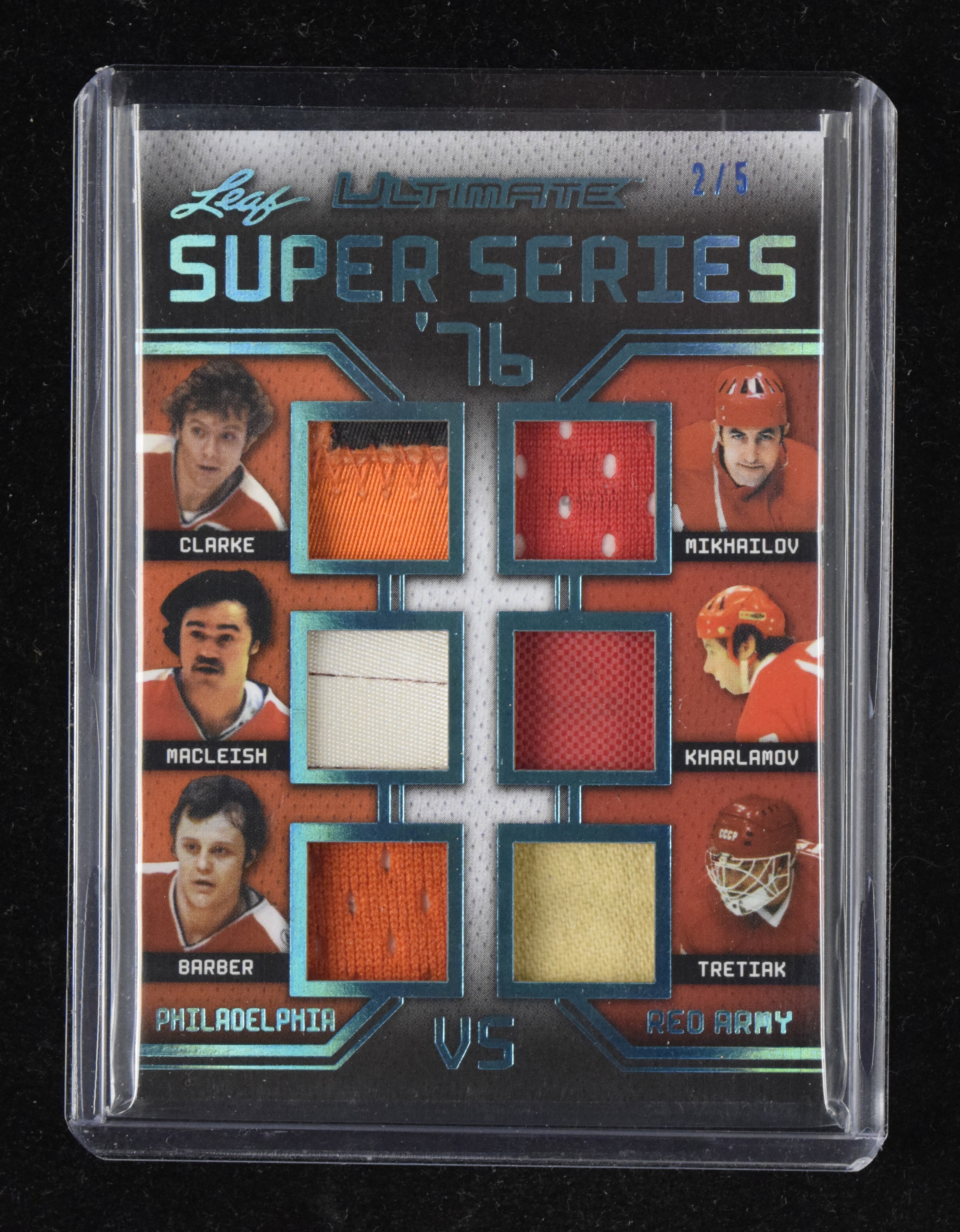 Description:Philadelphia Flyers & USSR Red Army 2017-18 Leaf Ultimate 6-player relics insert card #ed 2/5 (NM). 2017-18 Leaf Ultimate "Super Series '76 Relics Blue Spectrum" #USS-02 containing swatches from Bobby Clarke, Bill Barber, Rick MacLeish, Vadislav Tretiak, Boris Mikhailov, and Valeri Kharlamov. The card is numbered 2/5: NM